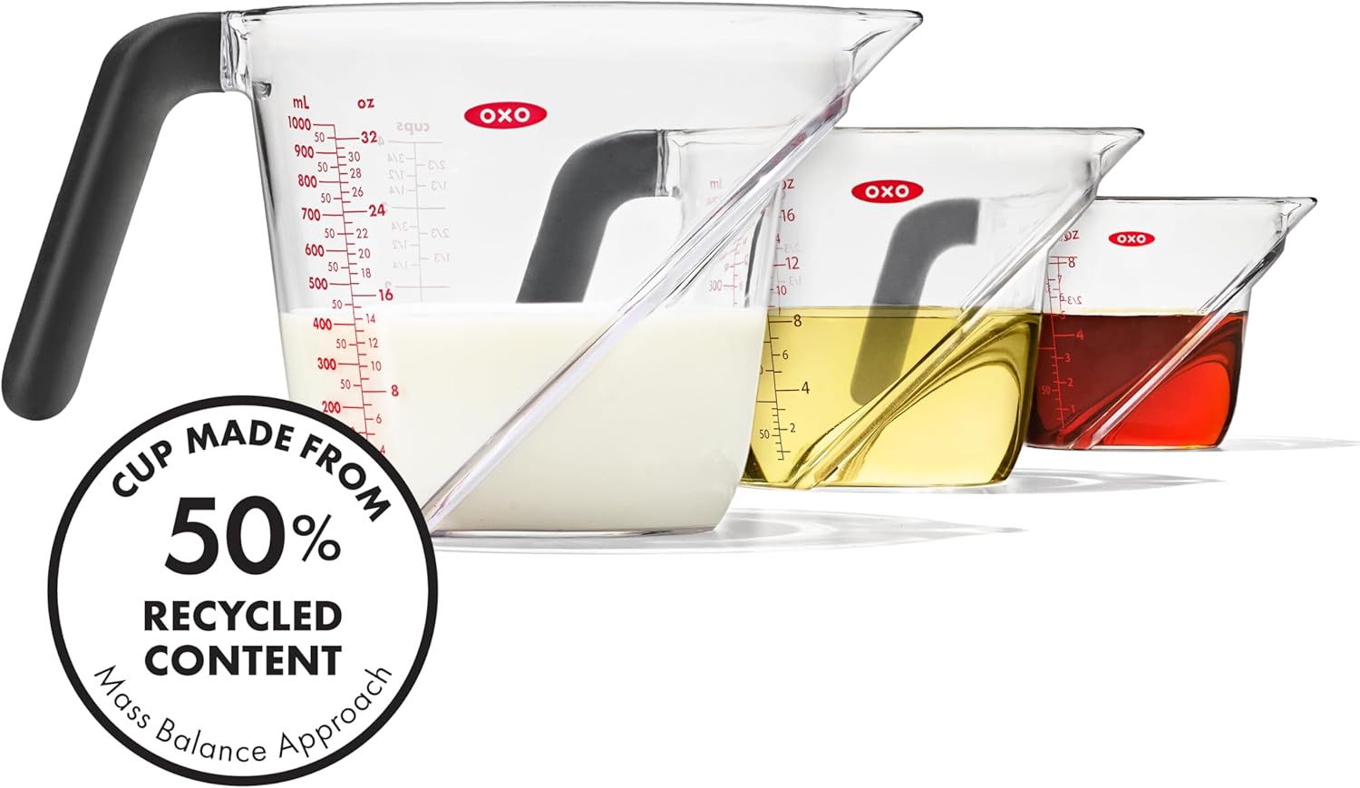 - Always Have the Right Size Kitchen Supplies : Set includes 1-Cup, 2-Cup, and 4-Cup OXO Measuring Cups, carefully calibrated and clearly marked with cups, ounces, and milliliters