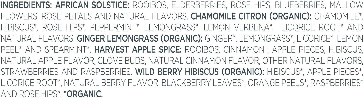 - HERBAL TEA ASSORTMENT with five varieties of our most popular, naturally caffeine-free, herbal tea blends - African Solstice, Chamomile Citron, Ginger Lemongrass, Harvest Apple Spice and Wild Berry Hibiscus.