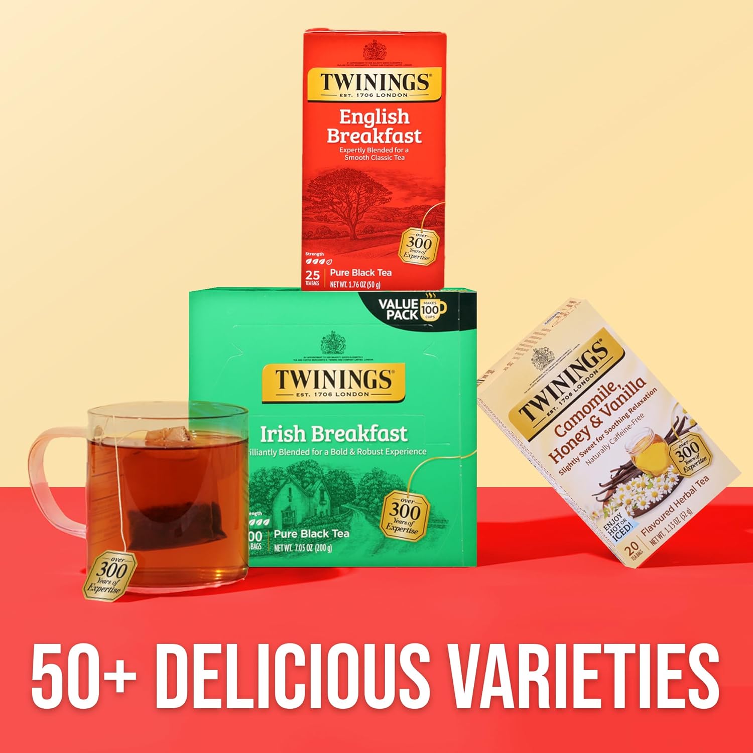 Twinings English Breakfast Black Tea Individually Wrapped Bags, 25 Count (Pack of 6), Flavourful, Robust Black Tea, Caffeinated, Enjoy Hot or Iced, 150 Teabags