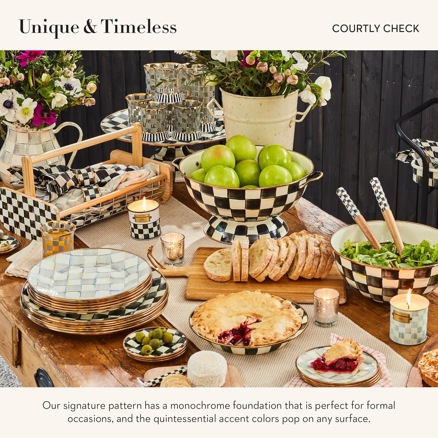 - ELEGANT SERVING PLATTER: The Courtly Check pie dish for baking features our glossy hand-painted black-and-white checks. Be sure the plate is at room temperature before placing it in a warm oven.