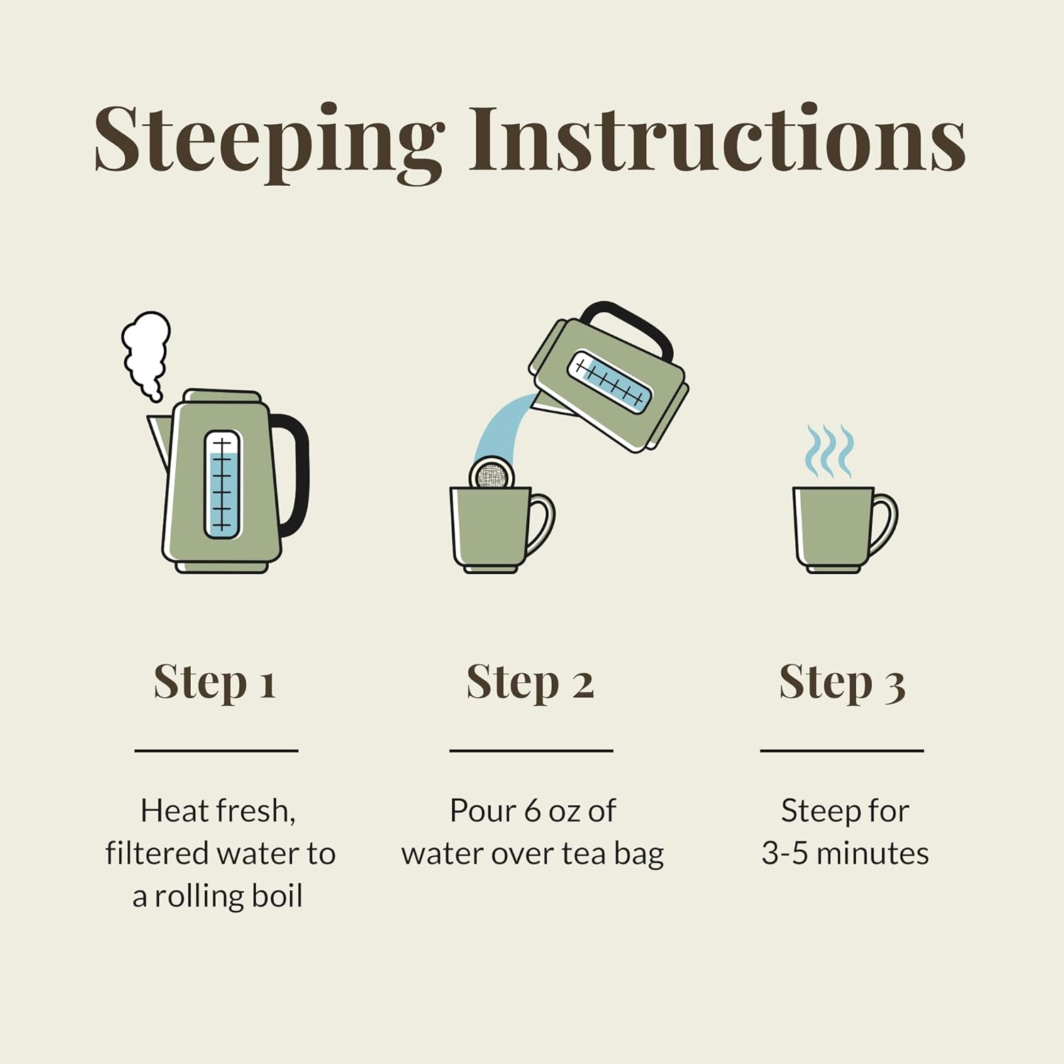 - STEEPING INSTRUCTIONS: Simply heat fresh, filtered water to a rolling boil. Then pour 6 oz water over tea and steep for 3-5 minutes.