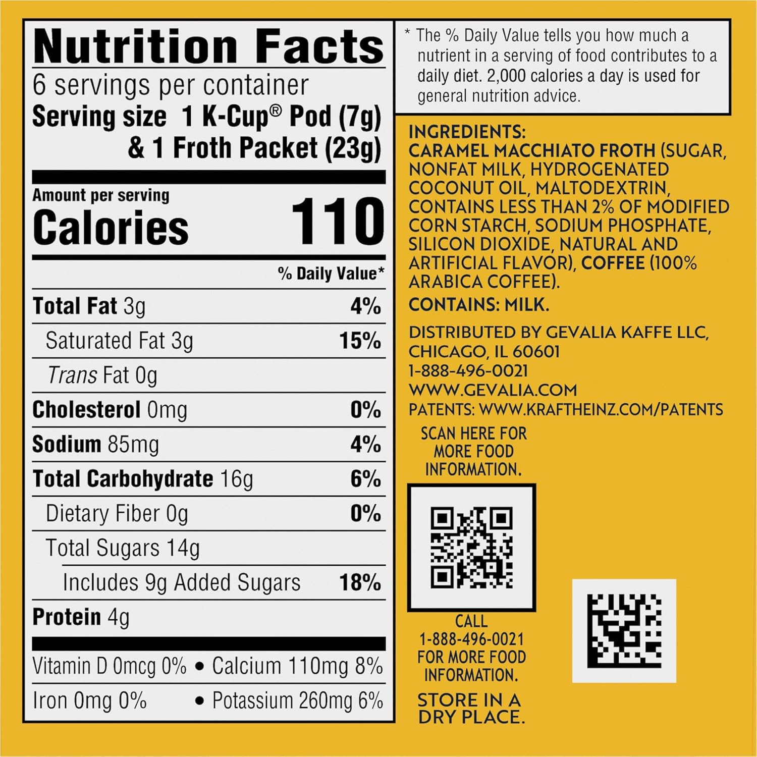 - 6 ct box of Gevalia Caramel Macchiato K-Cup Espresso Style Pods with Macchiato Froth Packets