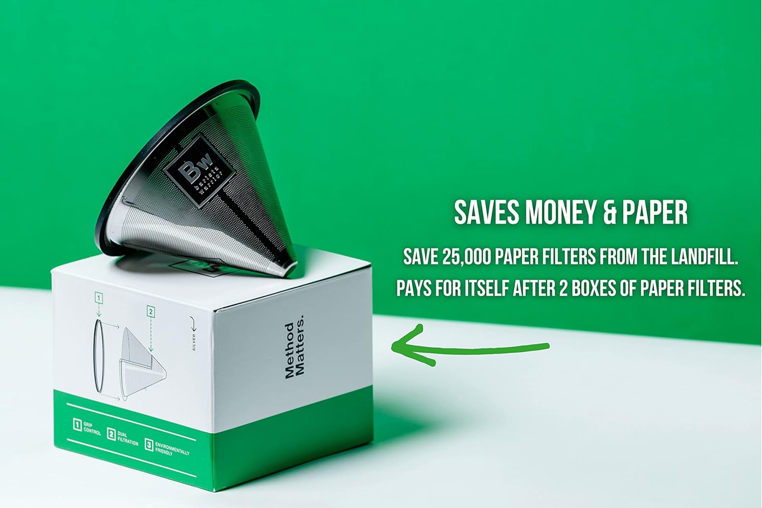 - REUSABLE COFFEE FILTER | SAVES MONEY - Each purchase saves 25,000 paper filters from heading to the landfill. By making the decision to switch to a metal cone coffee filter today you’re helping save our planet tomorrow. Save hundreds of dollars by switching to our metal filter, no more wasting money each month on paper filters.