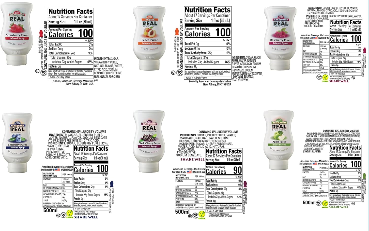 Reàl Fruit Infused Flavoring Syrup Variety - Strawberry, Raspberry, Peach, Blueberry, Black Cherry, Crisp Apple (Pack of 6, 16.9 FL OZ Bottles)