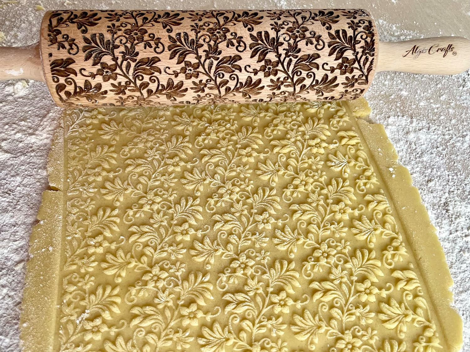 - Constructed out of highly durable Beech wood, this laser-etched rolling pin is optimally sized to roll out dough, with a large 7.9" embossing surface, 2.4" diameter, and 15.8" overall length (with handles).