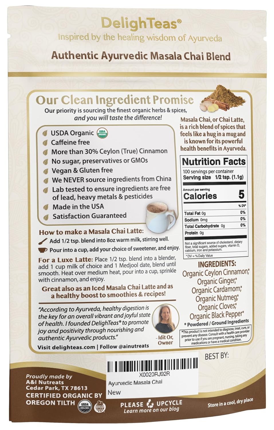 DelighTeas Organic Masala Chai Powder | Caffeine free, Unsweetened, Vegan, Keto | Ayurvedic Digestive Support blend for Chai Spice Tea | 100 Servings, 4oz
