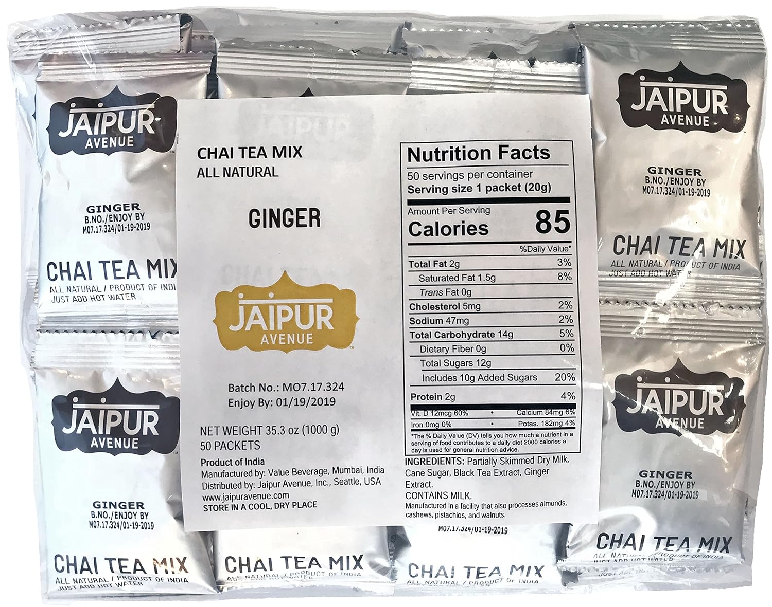 Jaipur Avenue Ginger Chai Tea Mix Crafted with All-Natural Assam Black Tea, Ginger, Cane Sugar, and Premium Dry Milk - Preservative-Free, Gluten-Free, Authentic Indian Chai Tea Latte (50-Count Bag)