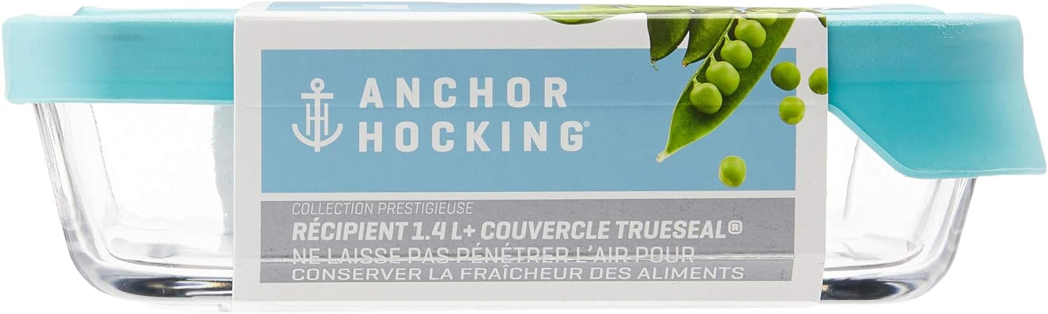 Anchor Hocking TrueSeal Glass Food Storage Containers with Mineral Blue Airtight Lids, 6 Cup Capacity (48 Oz), Rectangle, Pack of 4