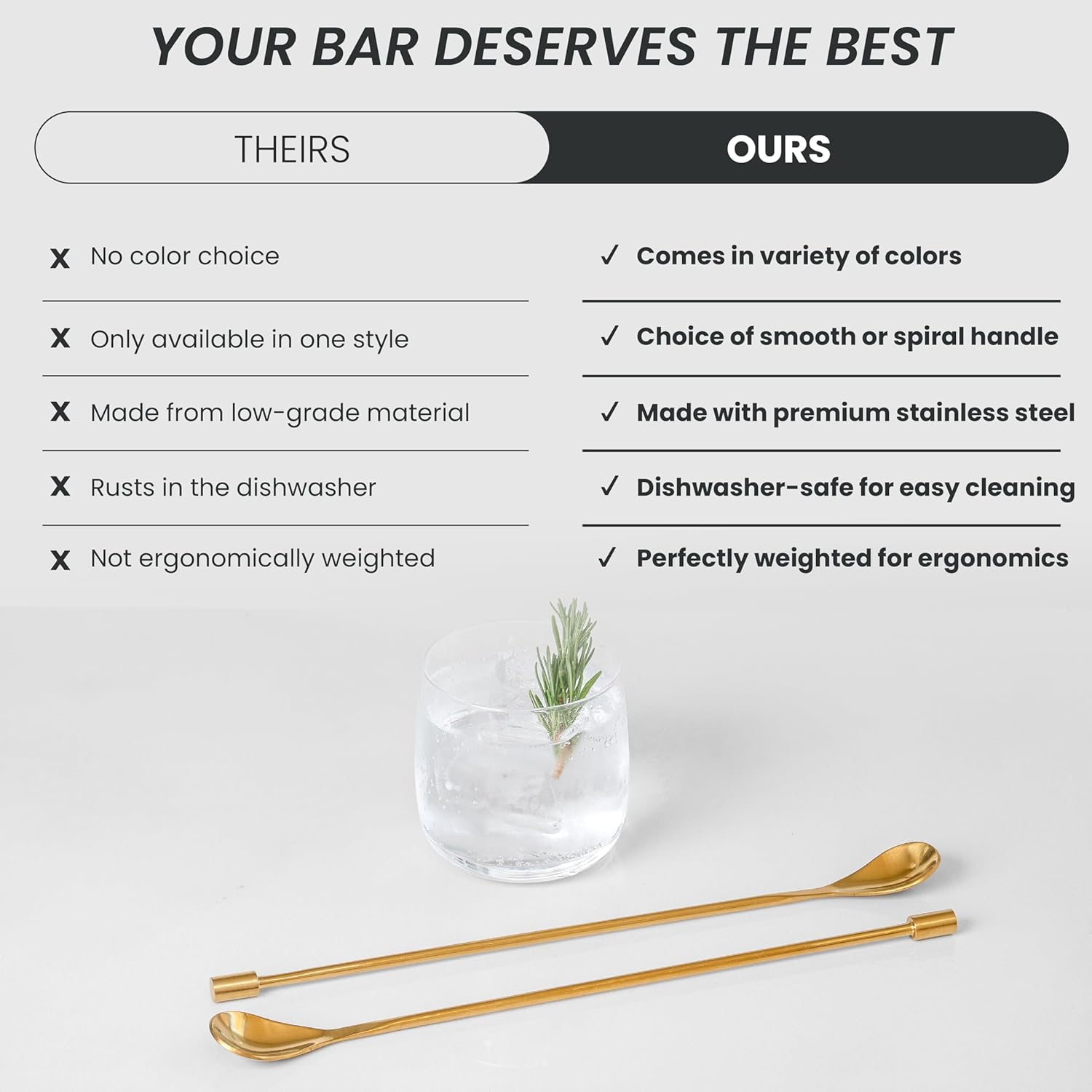 - HEAVY-DUTY 304 STAINLESS STEEL CONSTRUCTION: Crafted from rust-resistant, food-safe 304 stainless steel, these bartender spoons offer strength that stands up to high-volume use. With reinforced welds and a mirror-polished surface, they'll retain their shine through endless shifts and dishwasher cycles.