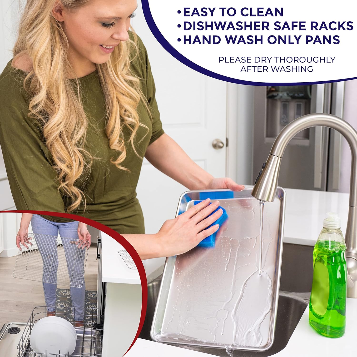 - Effortless Cleanup for a Seamless Baking & Cooking Experience: Hand wash our 1/2 aluminum baking tray, and toss the wire rack in the dishwasher with ease. Our cooling racks for cooking & baking, paired with the cookie sheet pan allow your food to crisp and cook evenly in lesser time.