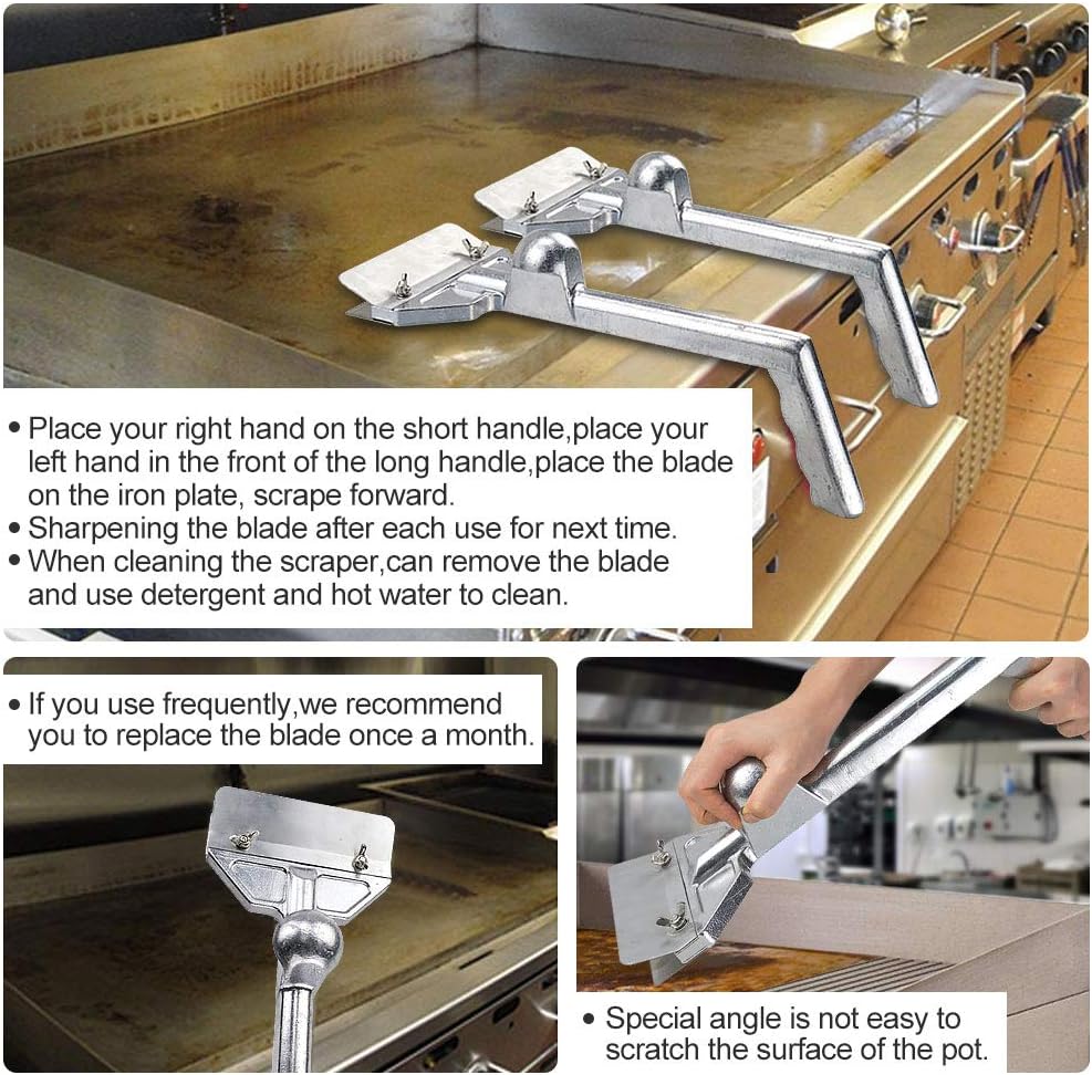 - √ COMFORT GRIP HANDLE:Griddle scraper features a very comfortable handle and gives you good control. Plus, it features a raised nob near the front so you can safely put more pressure on the blade for better results. No additional tools are required!