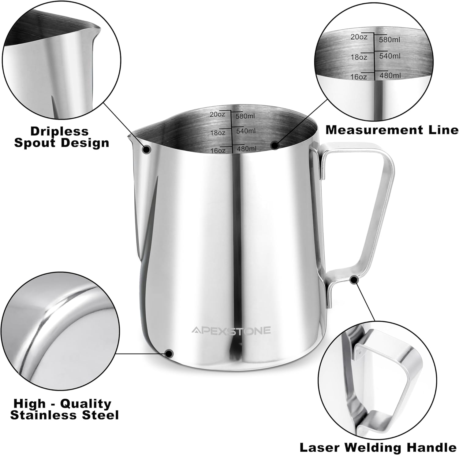 Apexstone Espresso Milk Frothing Pitcher 20 oz, Espresso Steaming Pitcher 20 oz, Coffee Milk Frothing Cup, Coffee Steaming Pitcher 20 oz/600 ml