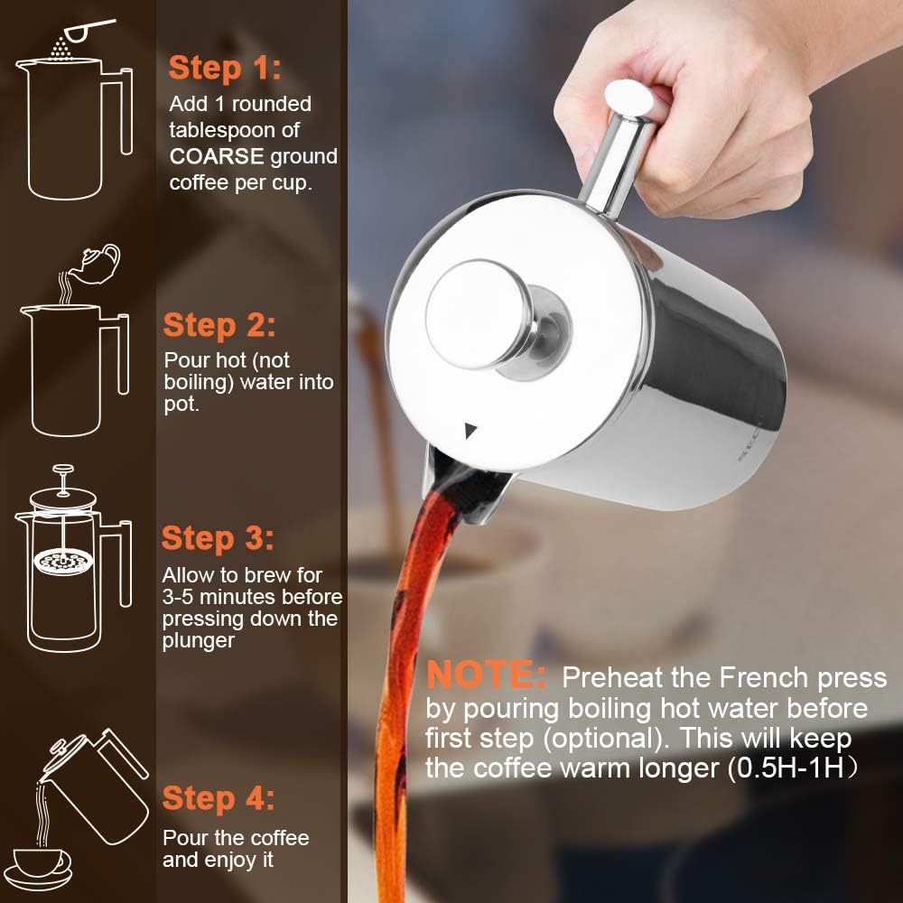 - DOUBLE-WALL 18/8 STAINLESS STEEL: Secura stainless steel French Press coffee maker is made from top quality 18/8 stainless steel, both the interior and exterior. It is made to outlast other coffee makers