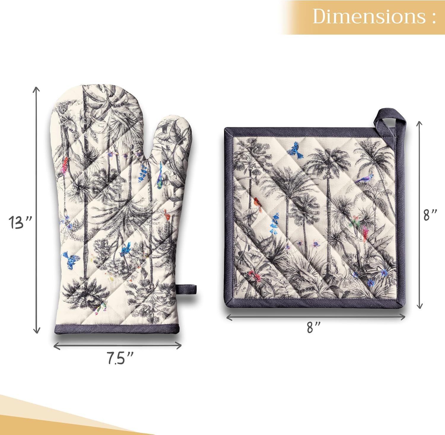 Maison d' Hermine 100% Cotton Oven Mitt & Pot Holder Set (7.5"x13" & 8"x8") Heat Resistant BBQ Cooking Gloves with Loop, Baking, Grilling, Kitchen, Handling Hot Pans (Amazonia)