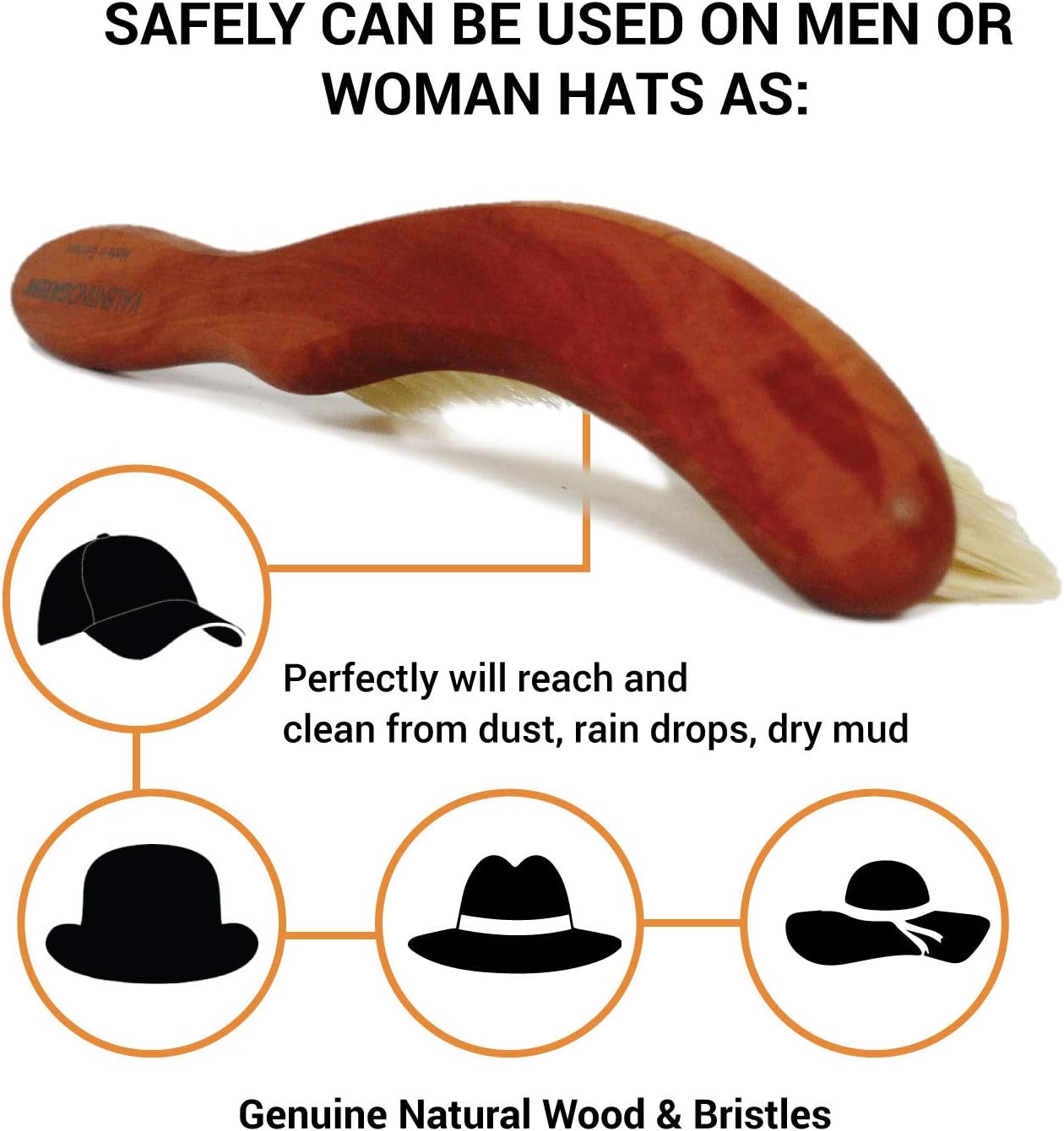 - ⚜️ INTENDED FOR ALL TYPES OF HATS – this 9 inch long cleaning hat was created to serve the owners of any type of hats regardless style or materials made. It will maneuver easily and will eliminate thoroughly any accumulations from leather or textile materials. Safely can be used on men or woman hats as: sun hats, baseball caps, flat caps, newsboy, fedora, trilby, pork pie hat, homburg hats, Panama hat, derby hats. Or just use it on western hats, stockman hats and even trapper hat or stormy kromer
