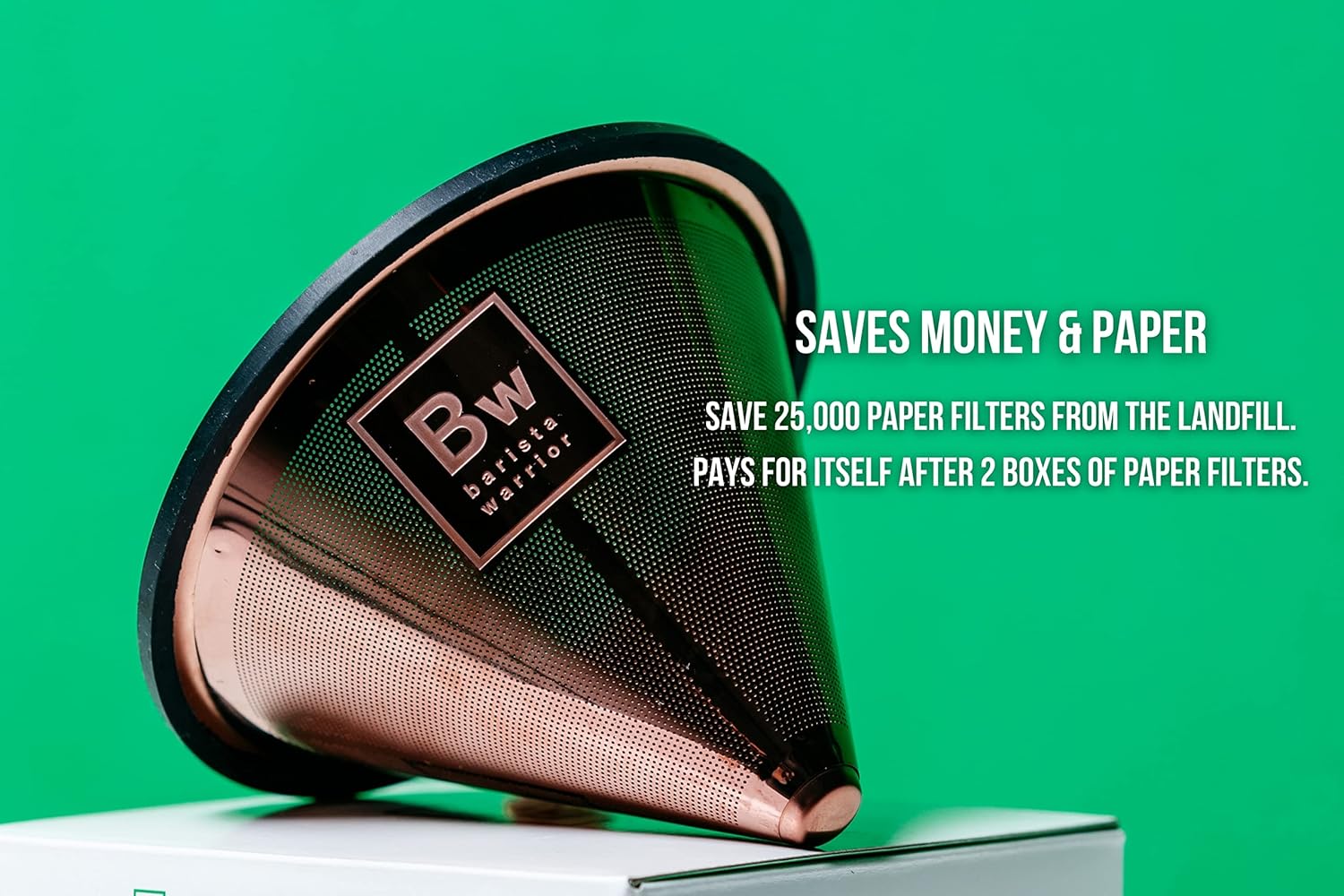 - REUSABLE COFFEE FILTER | SAVES MONEY - Each purchase saves 25,000 paper filters from heading to the landfill. By making the decision to switch to a metal cone coffee filter today you’re helping save our planet tomorrow. Save hundreds of dollars by switching to our metal filter, no more wasting money each month on paper filters.