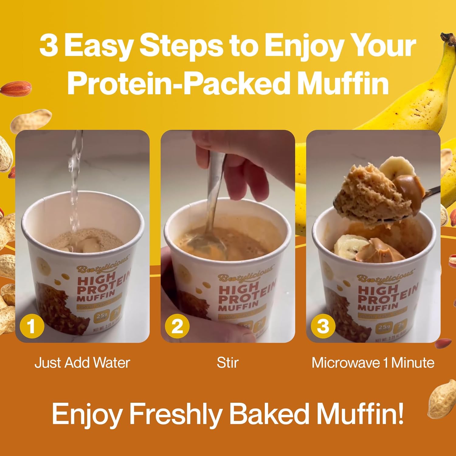 Bootylicious | High-Protein Muffin | 25g Protein, 7g Net Carbs, 2.32-2.75oz Cup, 12-Pack (Banana Peanut Butter)