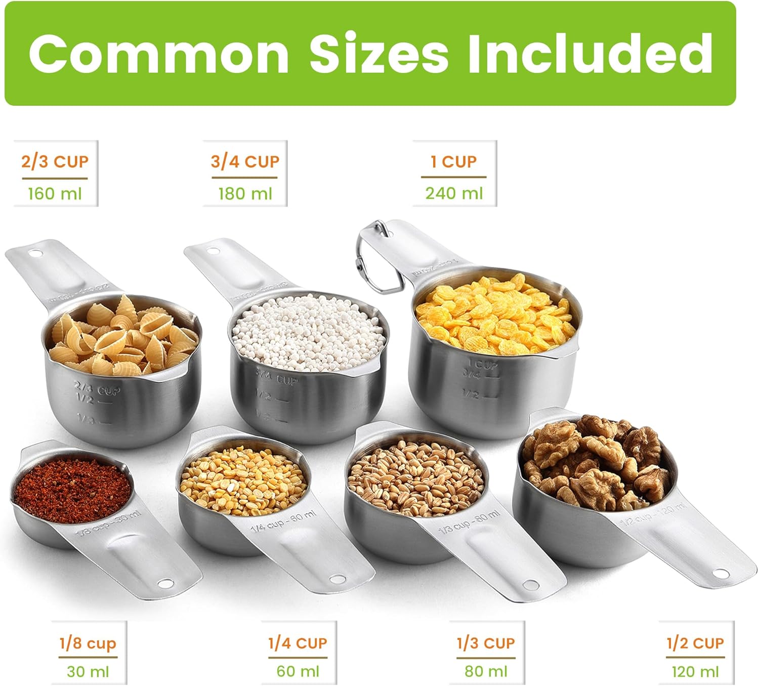 - Complete Set Of Kitchen Measuring Cups With All The Common Sizes You Need - You'll be able to make almost anything with the included sizes - 1/8 cup, 1/4 cup, 1/3 cup, 1/2 cup, 2/3 cup, 3/4 cup, and 1 cup plus a ring. You won't realize how useful they are until you have them.