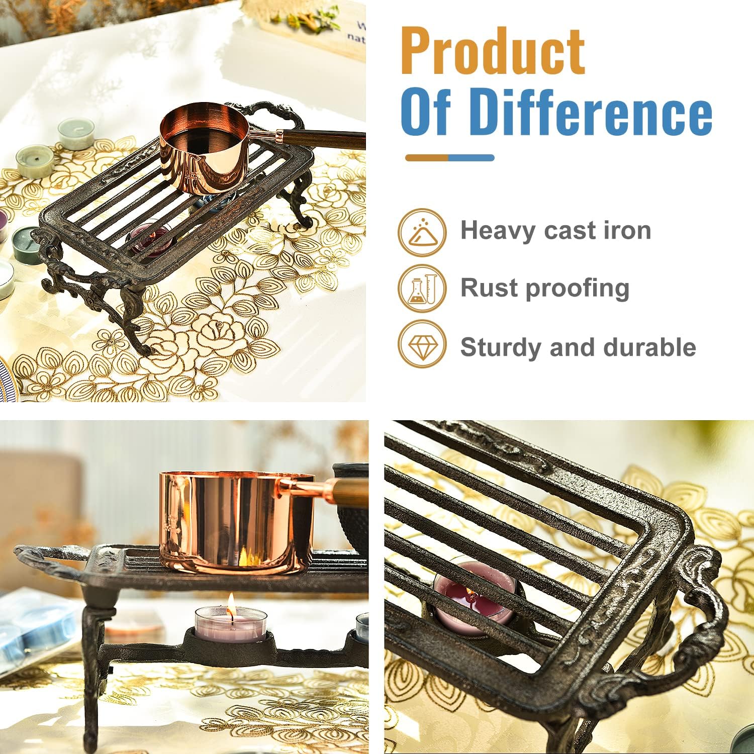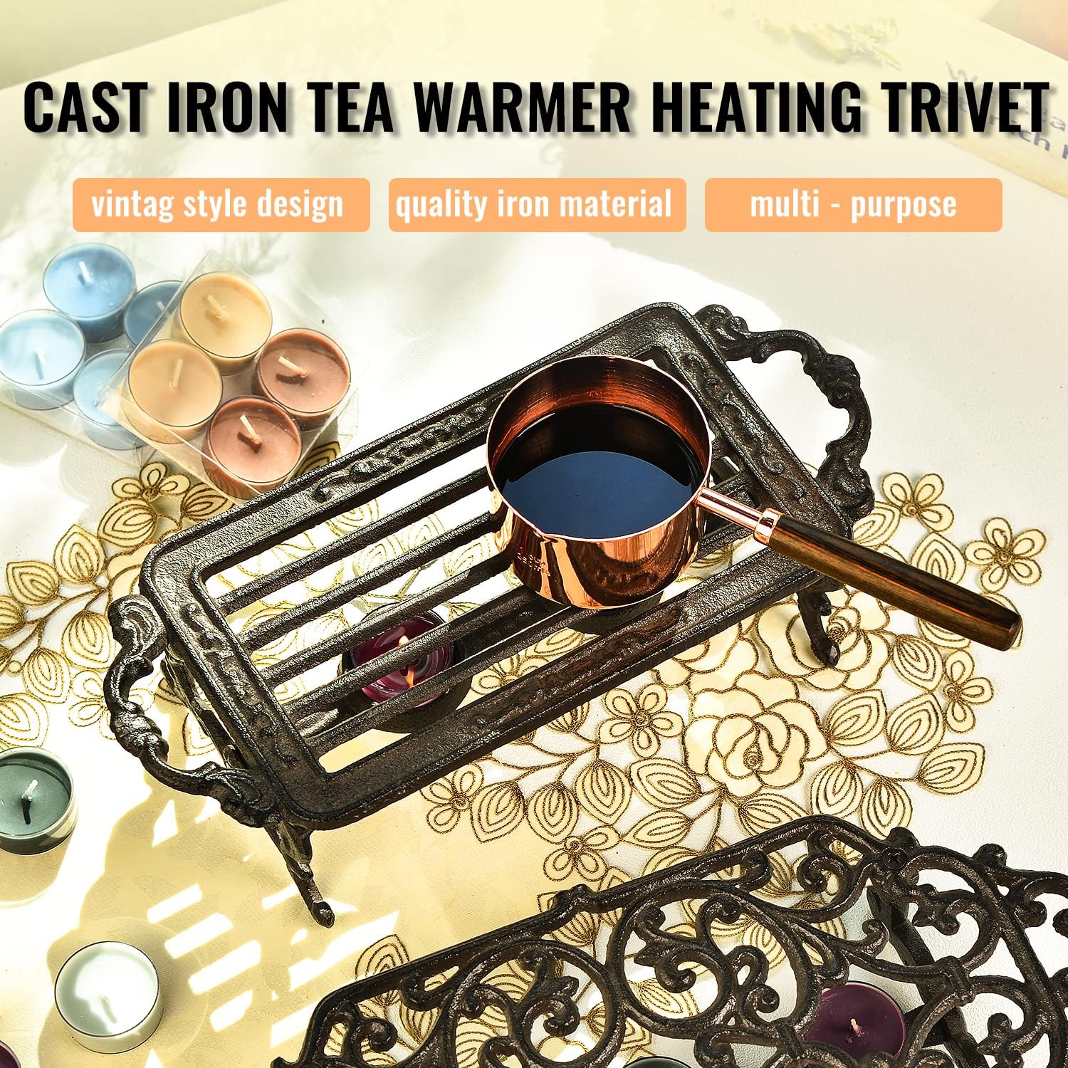 Sungmor Heavy Duty Cast Iron Teapot Dish Warmer Stable Holder for Tealight Stand | Tealight Warmer Decorative Stove for Villa Yard Balcony-Rectangle