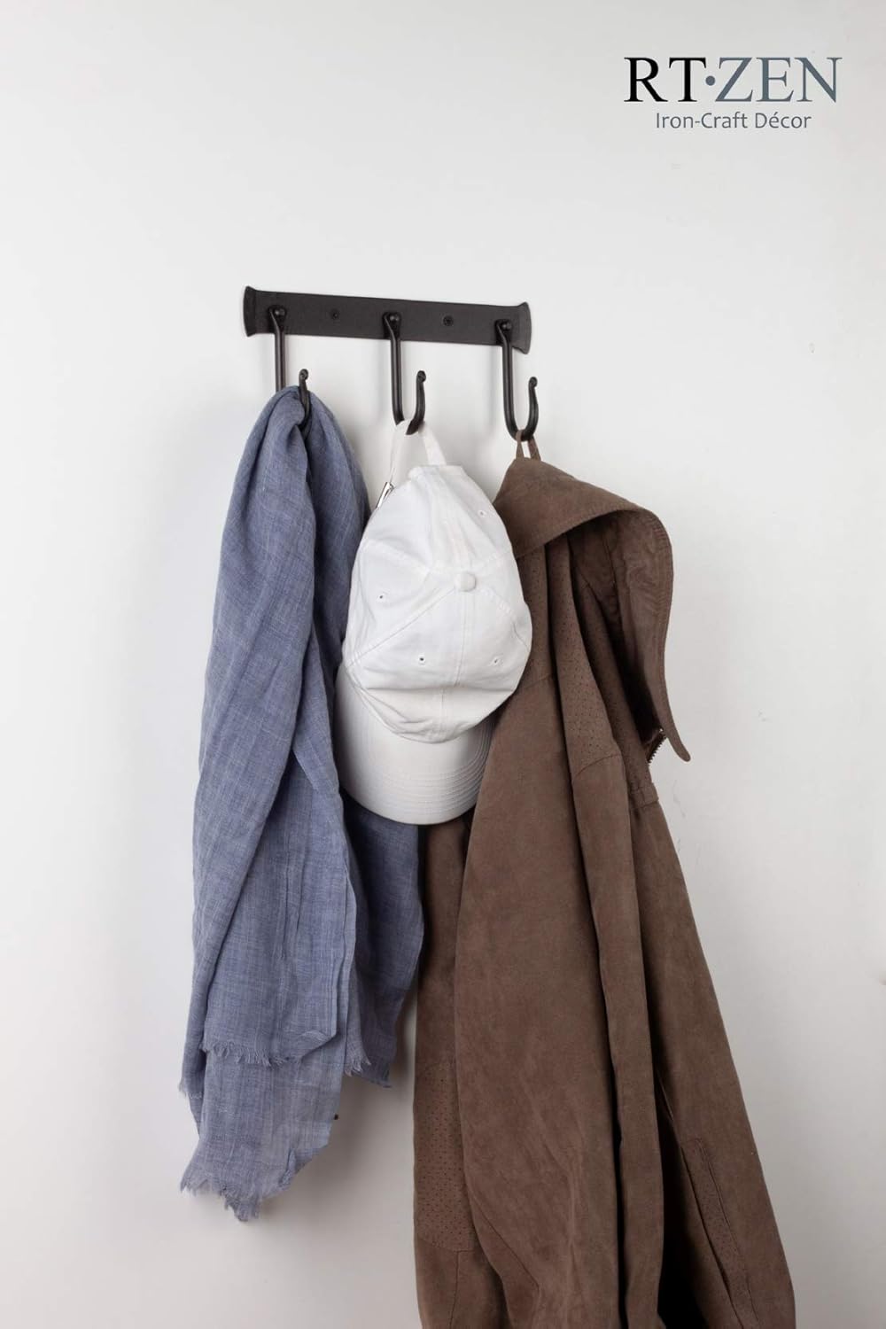 RTZEN Wall Mount Hook Set - Wrought Iron Decorative Rustic Metal Coat Hooks for Hanging - Handcrafted Classic Farmhouse Wall Mounted Black Hooks for Towel Robe or Hat Hanging - 3 Hook Rack