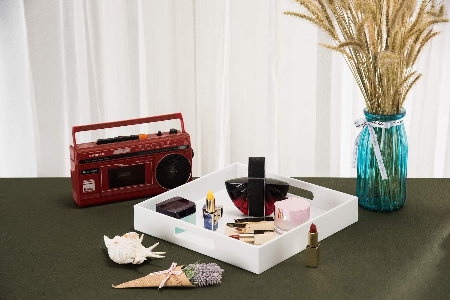 Glossy White Sturdy Acrylic Serving Tray with Handles-12x12Inch-Serving Coffee,Appetizer,Breakfast,Butler-Kitchen Countertop -Cosmetics Organizer-Vanity Table Tray-Ottoman Tray-Decorative