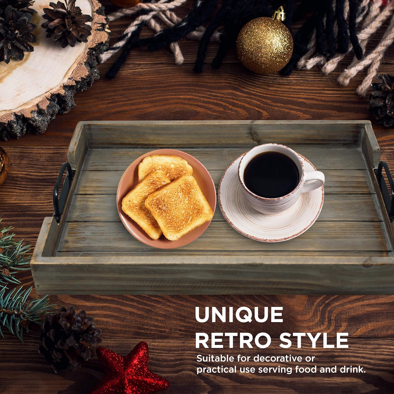 - USE FOR SERVING OR HOME DECOR – While These Butler Trays Are Great For Serving Guests, They Also Make a Great Decorative Piece For The Home! Use Them On The Dining Room Table or Hutch, As a Stylish Addition To Your Coffee Table, or As The Perfect Decor For Your Ottoman . The Matte Black Metal Handles and Natural Vintage Wood Grain Will Make Them a Great Focal Point To Complete Your Design.