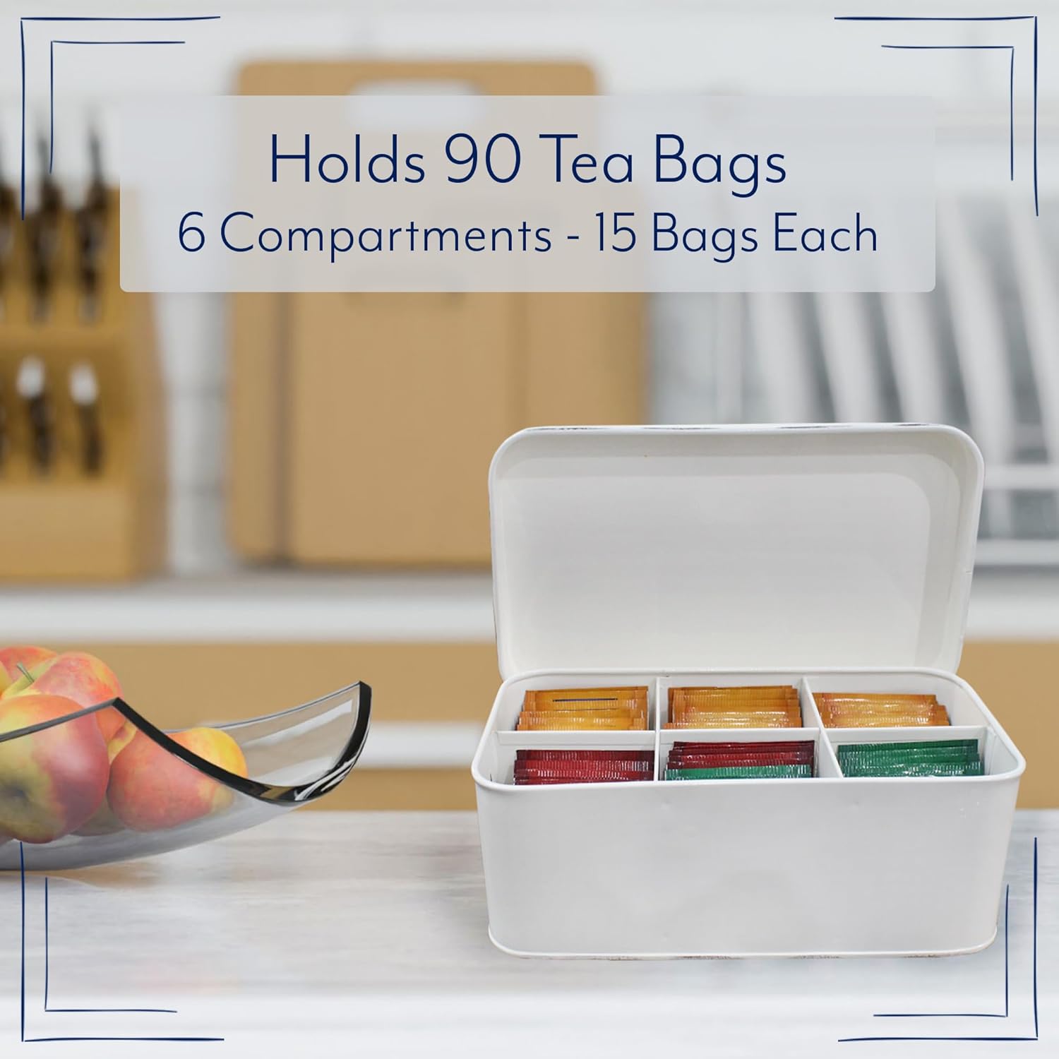 - SIZE: 9.25 inches long x 5.5 inches wide by 3.5 inches tall; sections are approx. 3 x 2.5 inches by 3 inches deep for 15 individually packaged or 20 loose tea bags each