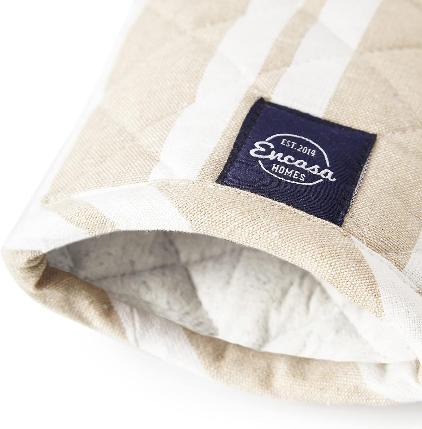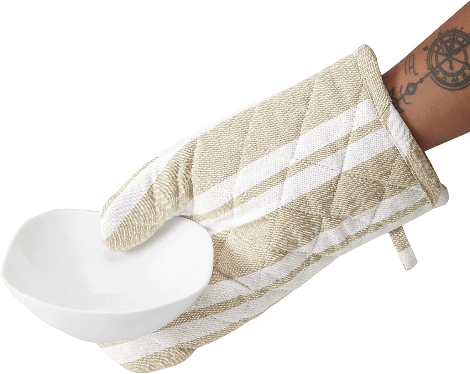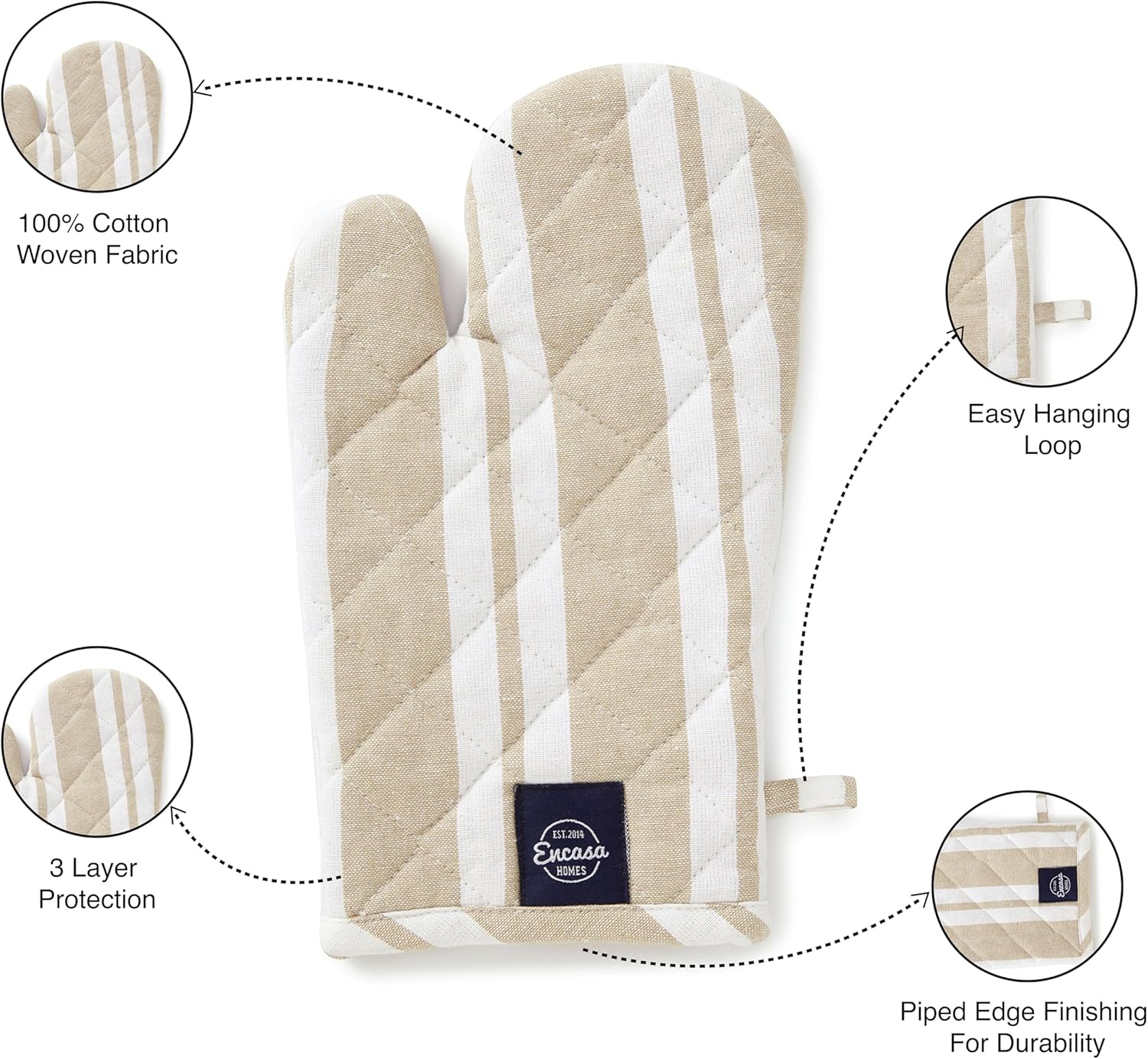 Encasa Homes Long 14 inch Oven Microwave Hand Gloves Mitts (2 pc Set) for Kitchen Cooking & Baking - Heat Resistant, Thick & Safe, Protection of Hands from Hot Utensils - Franca Beige Stripes