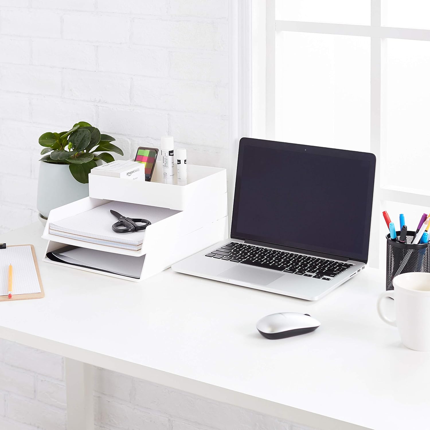 Amazon Basics Rectangular Plastic Desk Organizer Bundle, 3 Pieces Letter Tray/Accessory Tray, White