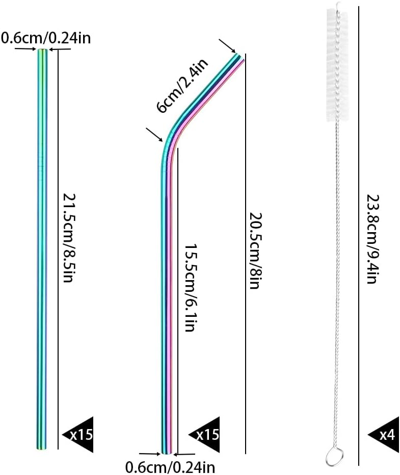 - 🍹 Super Valuable Set - 15 straight straws (0.2 in x 8.5 in), 15 bent straws (0.2 in x 8 in) and 4 cleaning brushes.