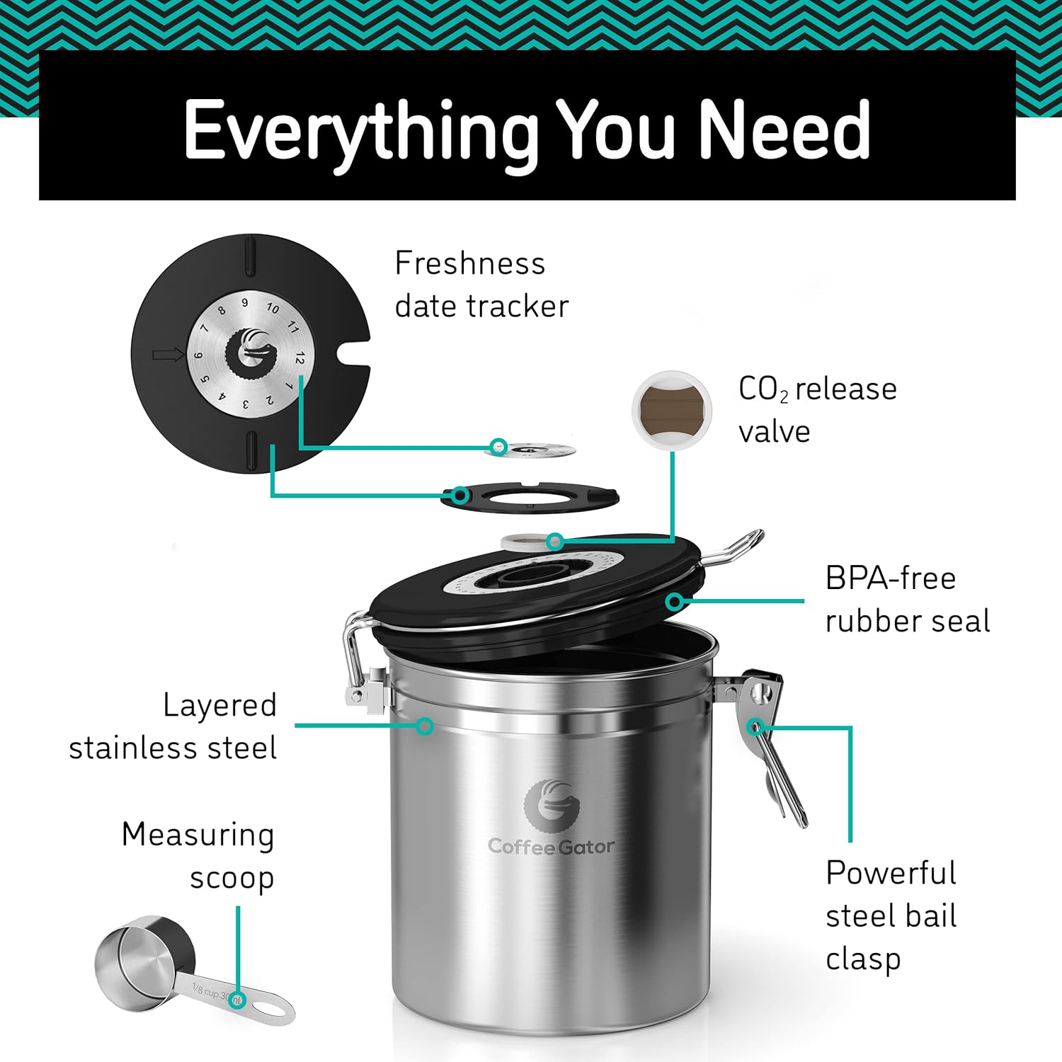 Coffee Gator Stainless Steel Canister - Medium 16oz, Gray Coffee Grounds and Beans Container with Date-Tracker, CO2-Release Valve, and Measuring Scoop - Ideal Coffee Lovers Gifts