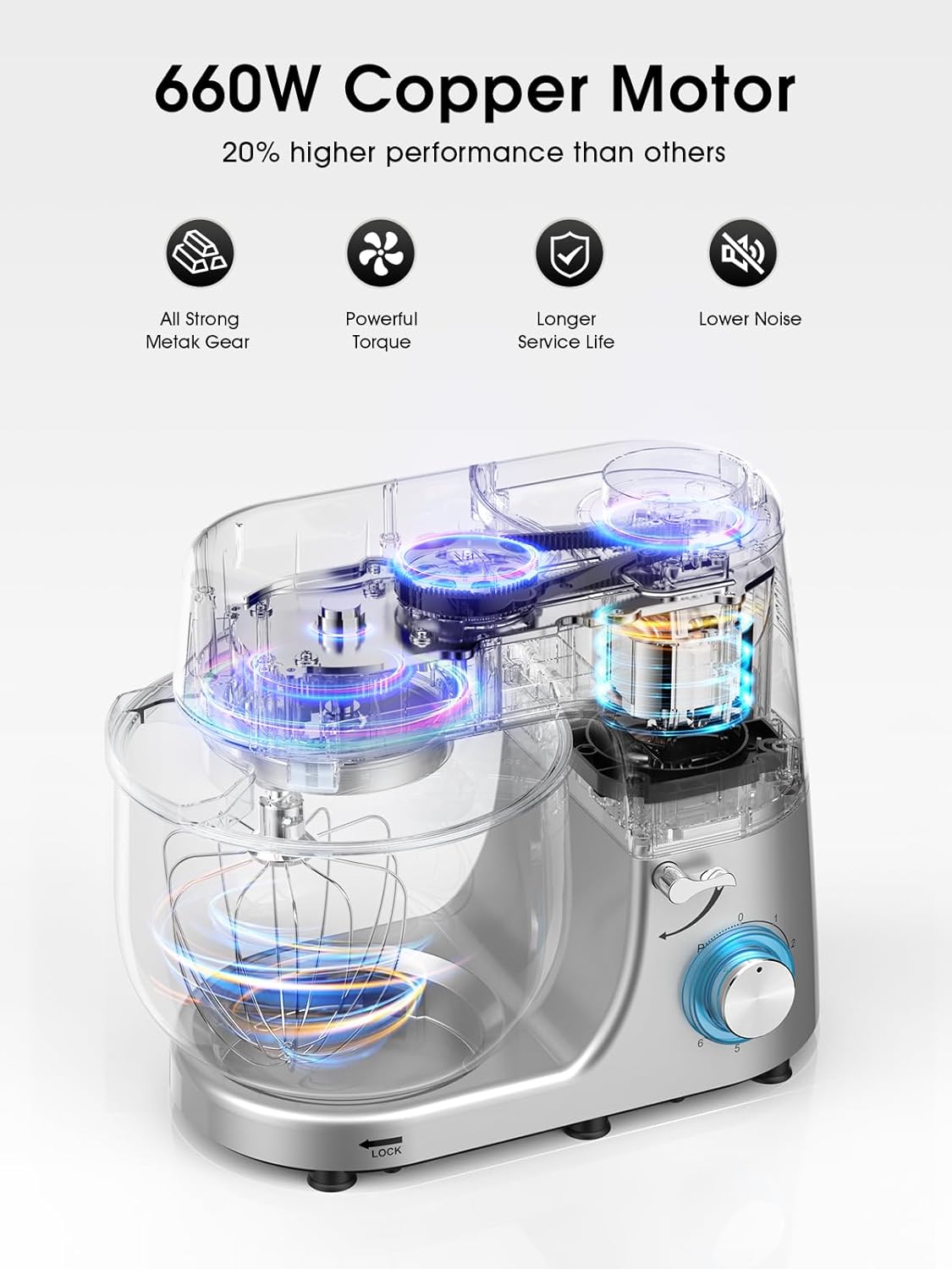 - Special Feature : Adjustable speed control, Tilt head Mixers, Smart chip controlled, Fully automatic electric stand mixer, 660W powerful high performance pure copper motor, 8.5Qt stainless steel bowl with 2 handle, 6+p speeds rotary knob with pulse function, Full metal gears + ball bearing + belt structure, LED light as power indicator, Low noise, 360° planetary mixing, Strong suction cups for more steady, Over-Heating and overload protection, Dishwasher safe, ETL certificate Adjustable speed control, Tilt head Mixers, Smart chip controlled, Fully automatic electric stand mixer, 660W powerful high p… See more
