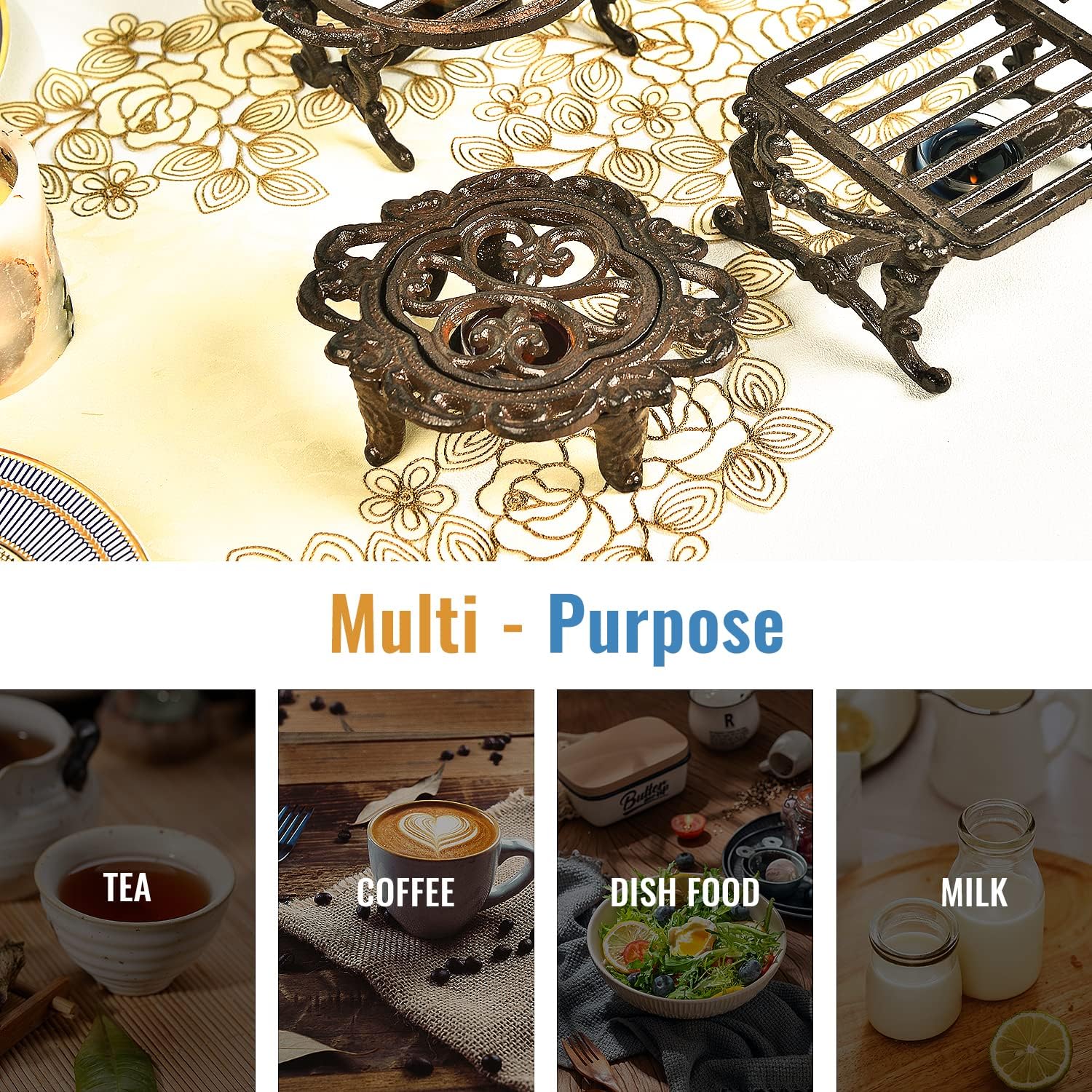 Sungmor Cast Iron Teapot Warmer Dish Cups Heater Pot Trivet - Rustic & Graceful Pattern Design with Tealight Holder - Heavy Duty & Decorative Candle Holder Stands for Heat Food Coffee Milk or Tea