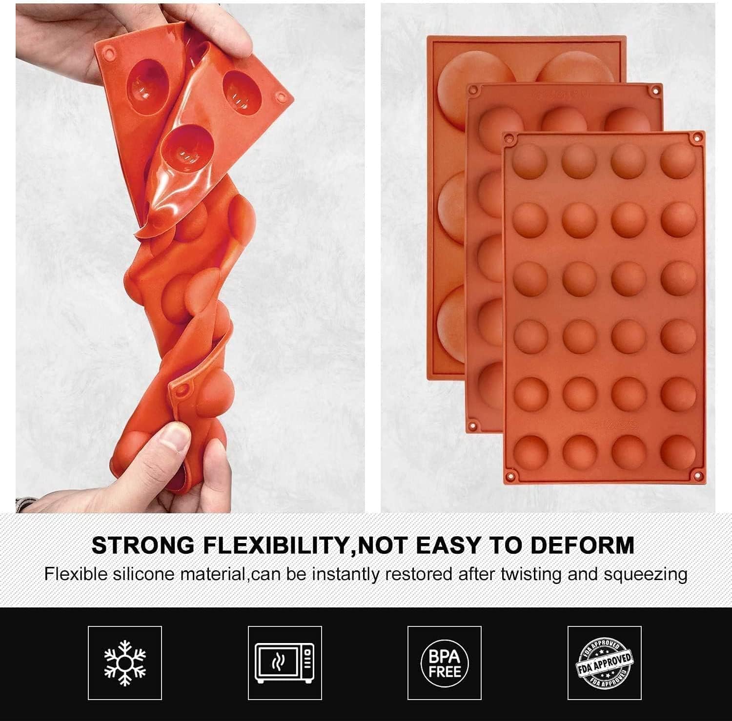 - LONG-LASTING TO USE: Hot cocoa bomb mold semi circular silicone molds can be used over a wide temperature range of -40°F to 446°F, This long-lasting and flexible silicone mold won't crack or break like plastic one, perfect for making chocolate snacks