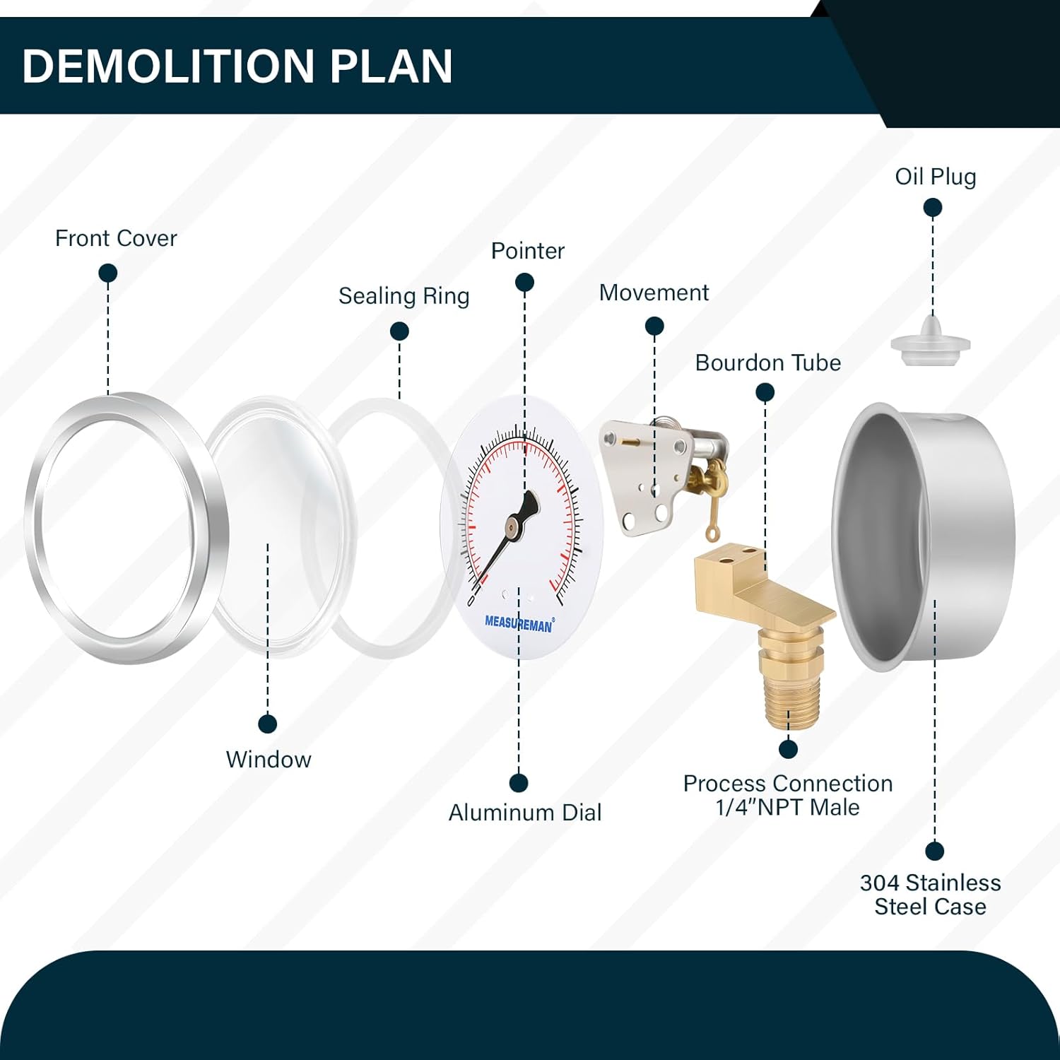 - Stainless steel case, brass wetted parts, glycerin filled