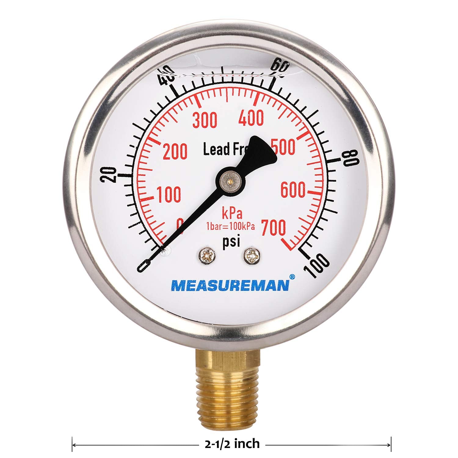 MEASUREMAN Lead-Free Pressure Gauge, 2-1/2inch Dial, Glycerin Filled, 0-100psi/kpa, Stainless Steel Case, 1/4inchNPT Lower Mount