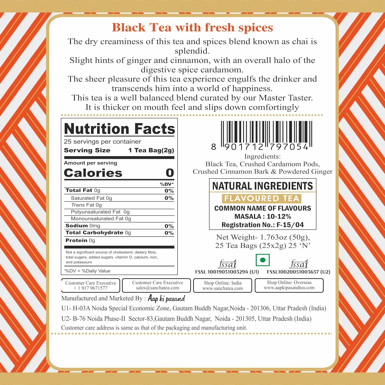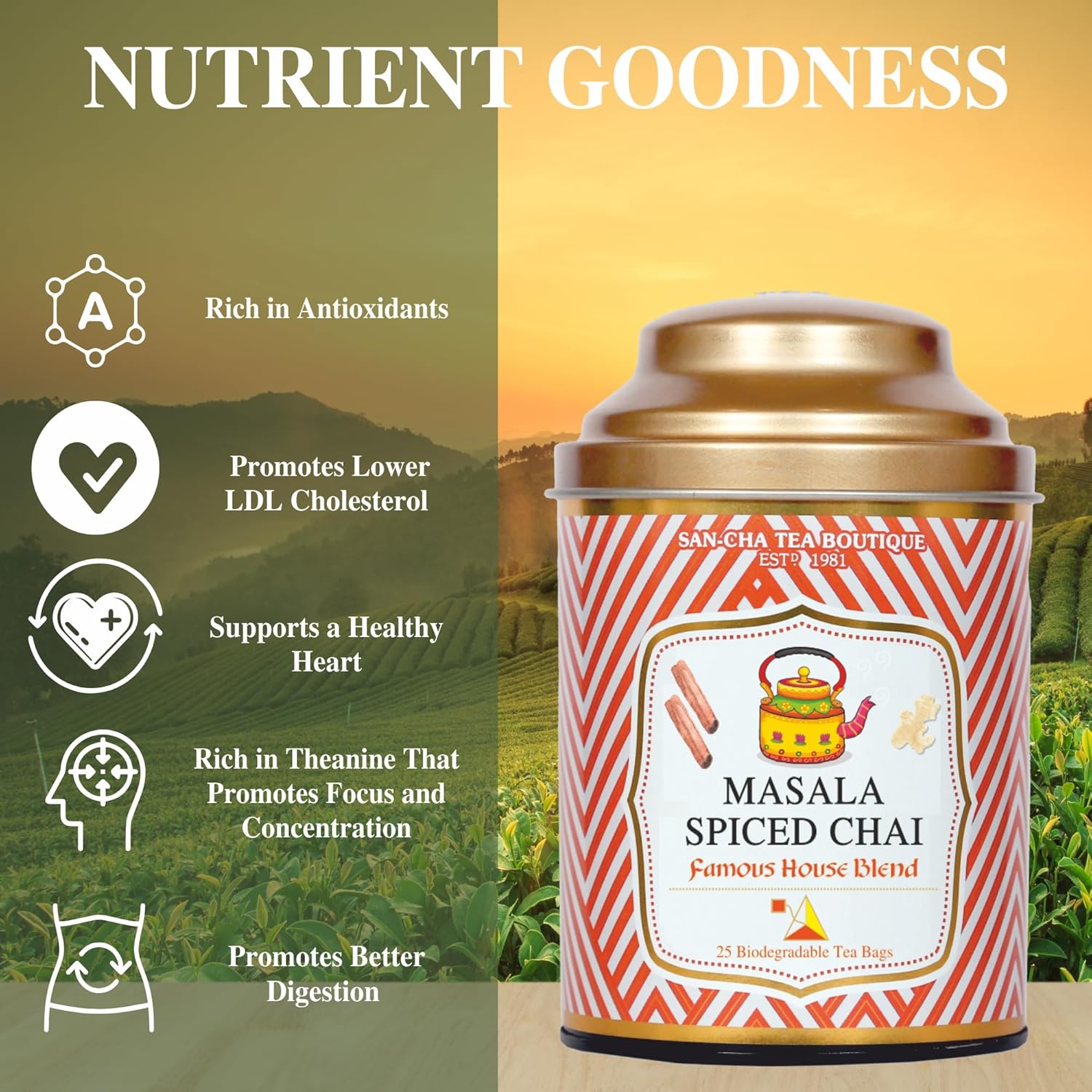 Sancha Tea Boutique, Masala Chai, Spiced Tea, 25 Pyramid Bags, India’s Famous Chai, Blend of Cinnamon, Ginger & Cardamom