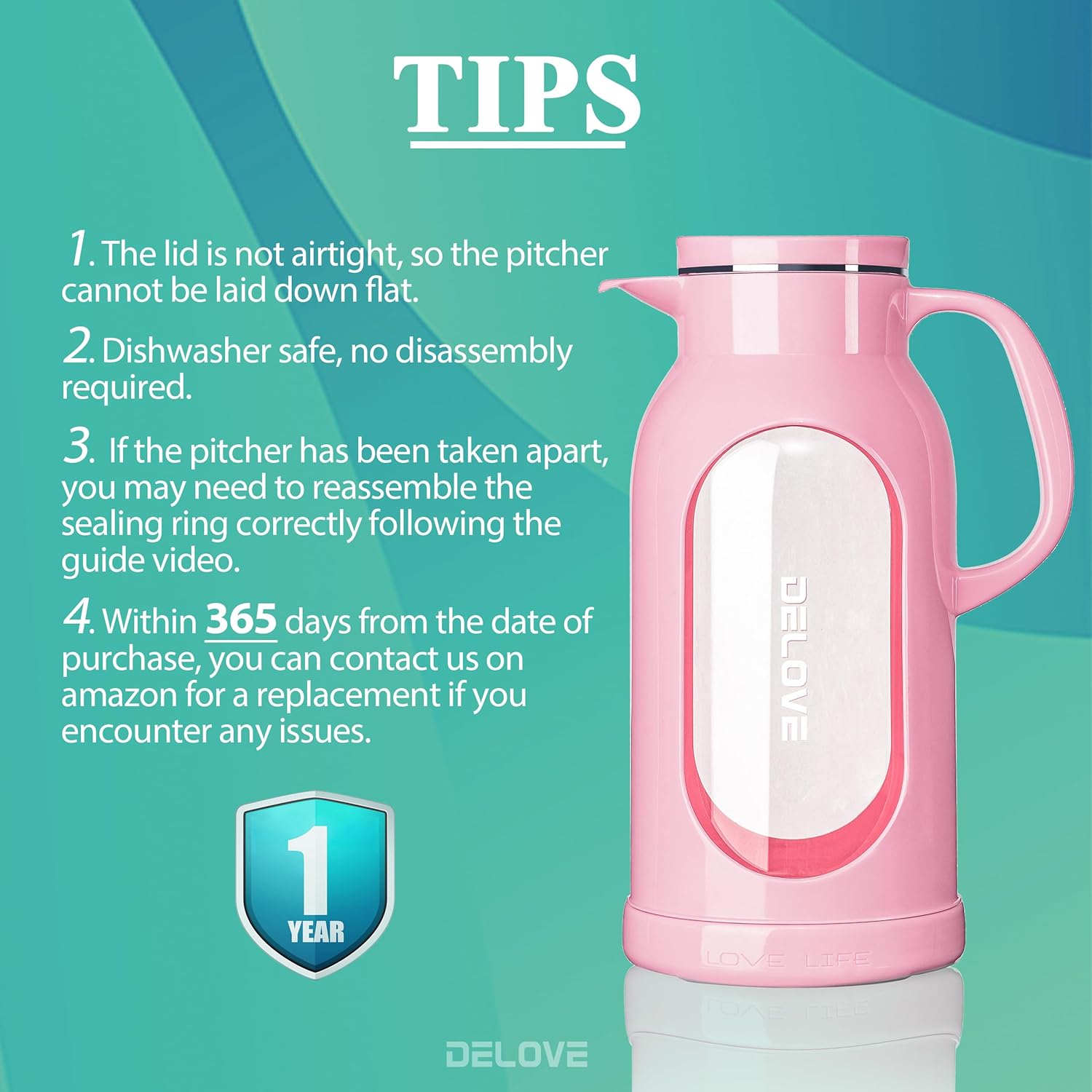 Delove 68 oz/2 Liter Glass Pitcher with Shatterproof Shell - Heat Resistant Glass Liner - Stainless Steel Lid - Carafe & Jug for Iced Tea,Hot/Cold Water,Homemade Juice Beverages (Pink)