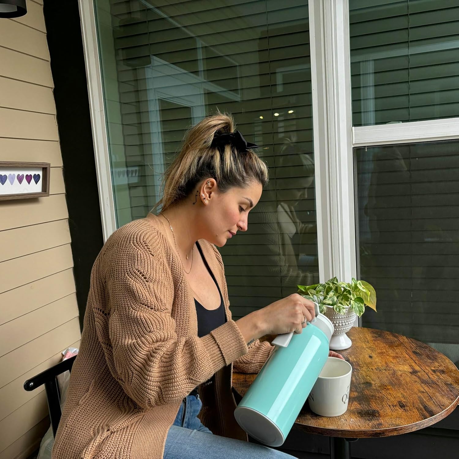 - USER FRIENDLY: GiNT 51 oz large thermal carafe features extra wide top opening, easy for cleaning and adding ice cubes. It’s comfortable handle design is made for single hand, simple-push button enables pouring without leaking, dripping or spilling. Ideal used as bedside, restaurant, office, party, camping, travel insulated coffee carafes.
