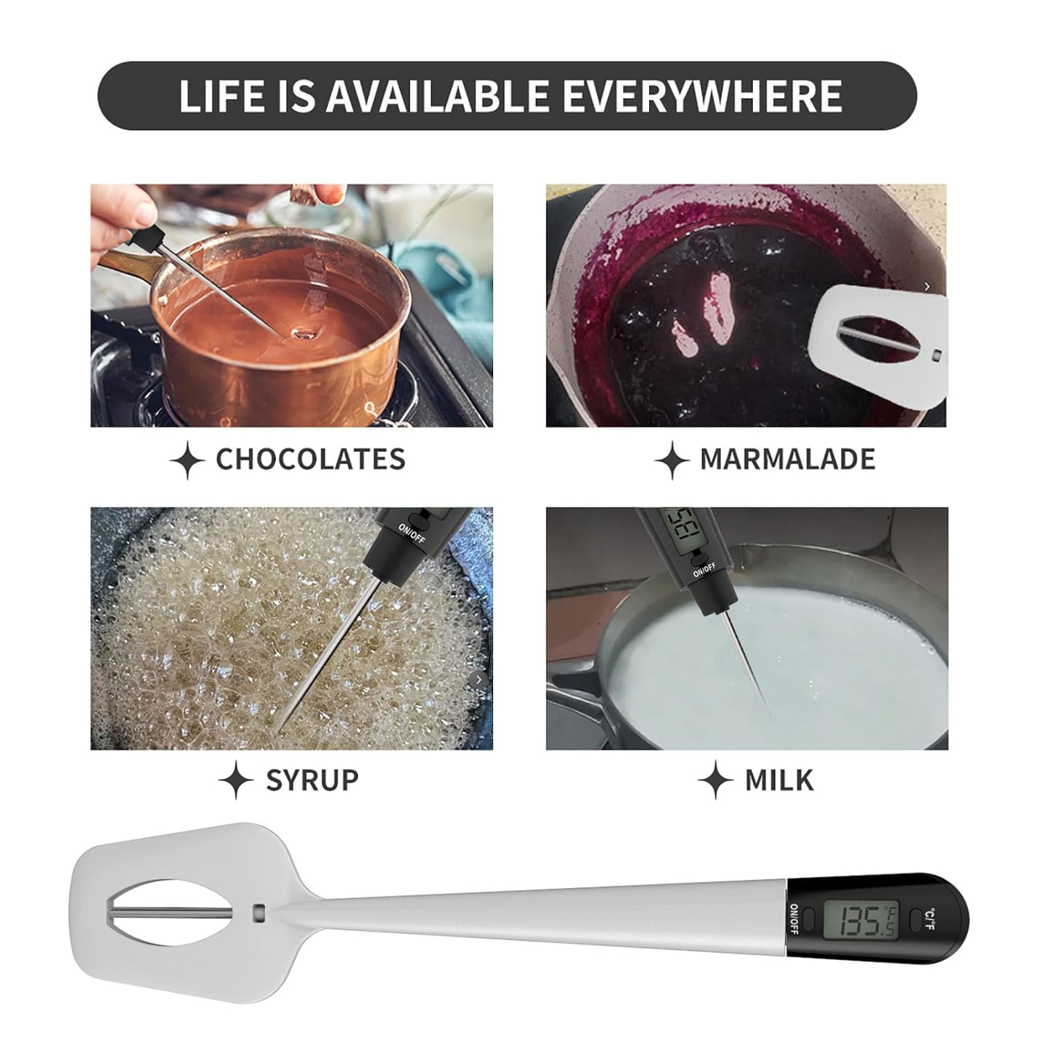 - MULTIPURPOSE DIGITAL SPATULA THERMOMETER – 12.5-Inch Digital thermometer spatula is a spatula for chocolate,candy and jam. Also a digital candy thermometer with pot clip, oil cooking thermometer, candy thermometer for candy making. the silicon spatula is very good kitchen aid durable BPA free food safe silicon materials,also a canning thermometer for jam, a great tool for chocolate, sauce, syrup, candy, deep fry kitchen cooking
