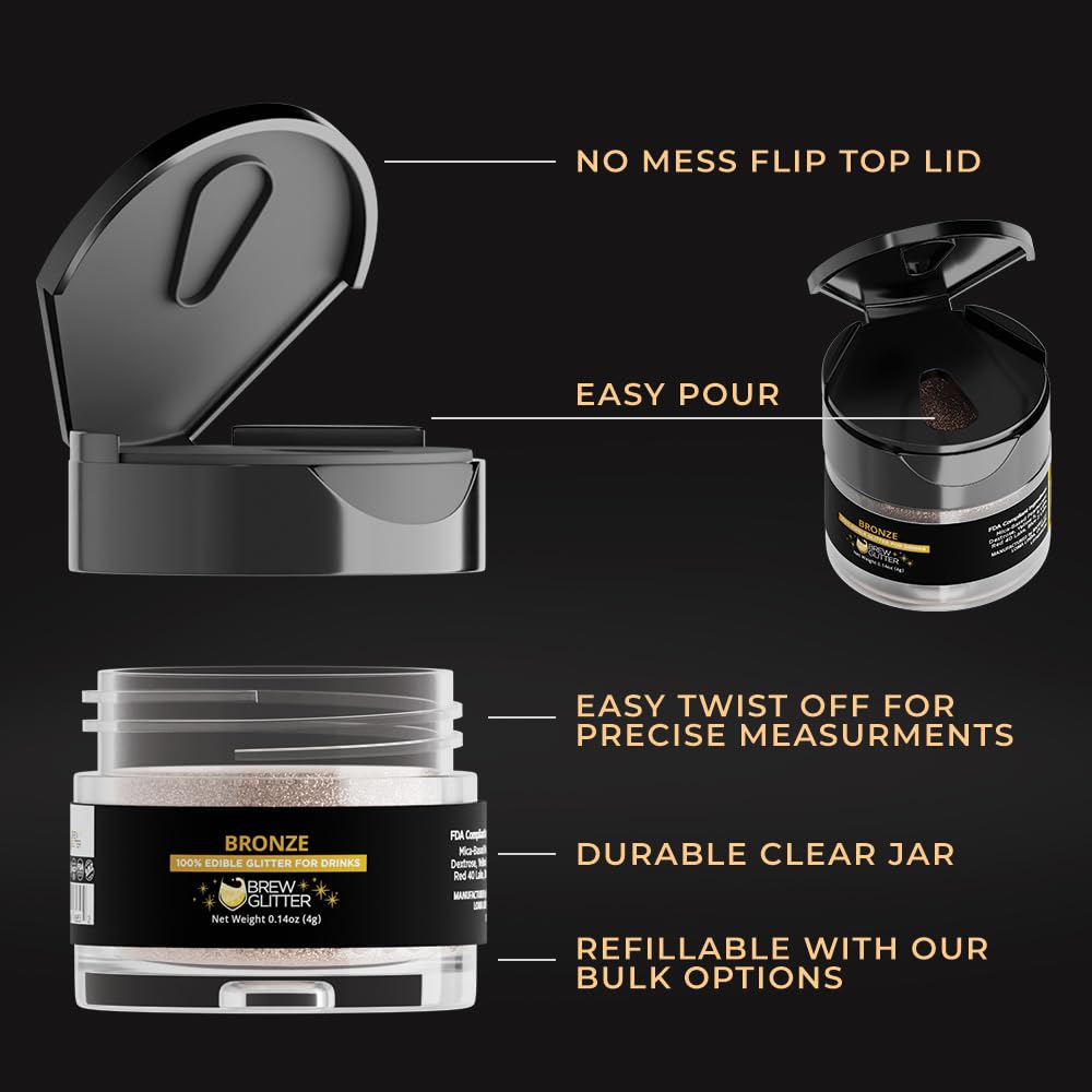 - 💫 A swirl of bronze edible drink glitter adds depth and sophistication to any beverage. Simply open the flip top, pour in Brew Glitter, stir, and watch it glisten!