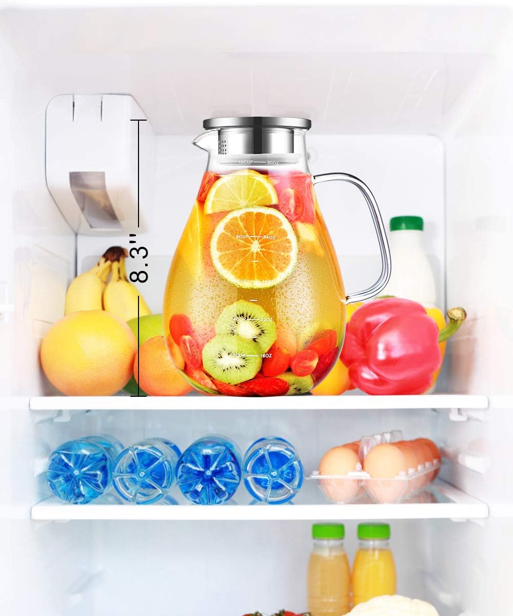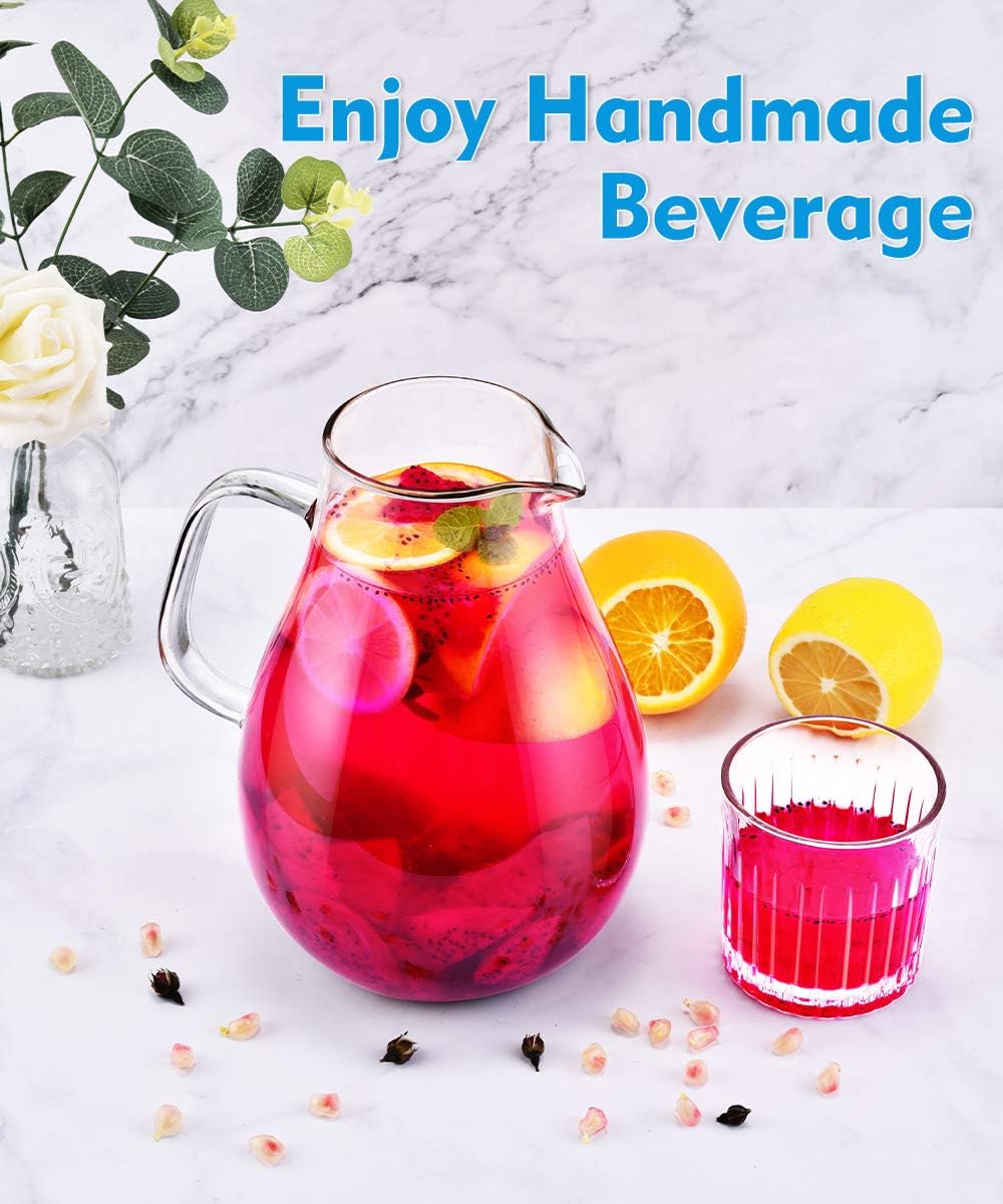 - Premium Quality: Water Pitcher is made of lighter and stronger borosilicate glass, non-lead and heat&cold resistant, handmade with wide mouth, wider handle and drip-fee lid, you can effortlessly pour infused beverages without your fruit and ice slipping out of the spout