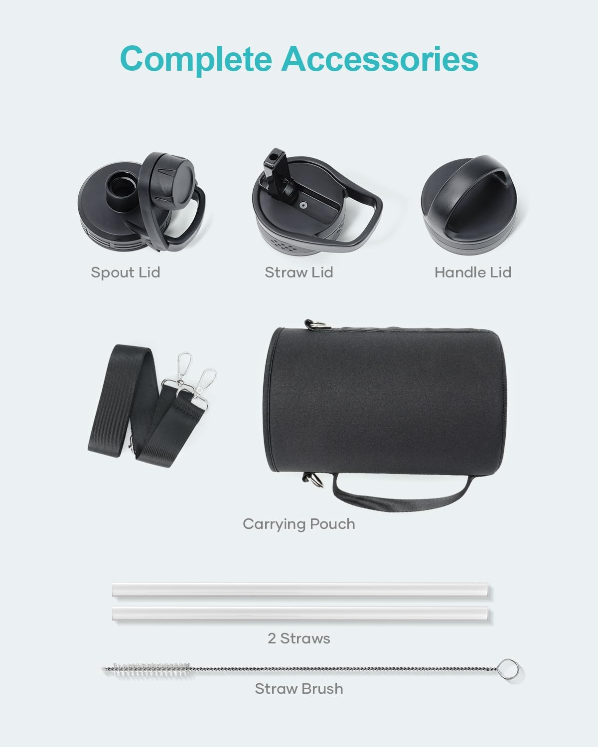 BUZIO 64 oz Water Bottle Insulated with Straw & 3 lid and Carrying Pouch, Leak Proof Half Gallon Stainless Steel Water Flask Jug, Cold for 48 Hrs Double Vacuum Thermo Canteen, BPA-Free, Shadow