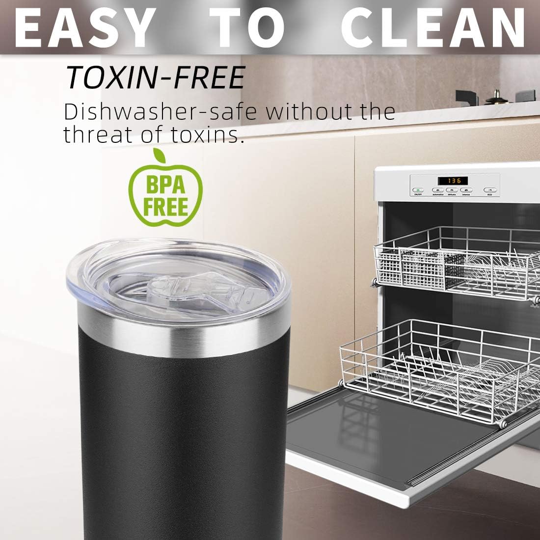 - LIFETIME DURABILITY:304 food grade stainless steel body, BPA free, healthier than plastic cup. The insulated tumbler never sweat due to the Vacuum insulated design. Powder coating on the outside fits more comfortably in your hand, looks good, anti-slip