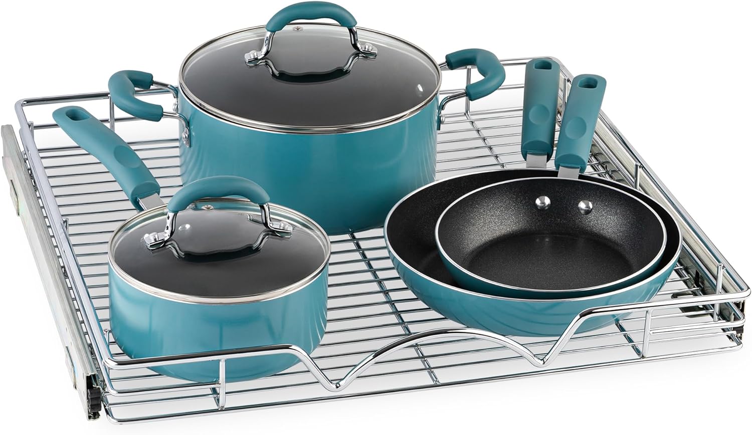 - HIGH QUALITY: Made of durable metal with chrome finish the pull out shelf for kitchen cabinet is simple and easy to install. Designed to fit any style of cabinetry and easy to clean.