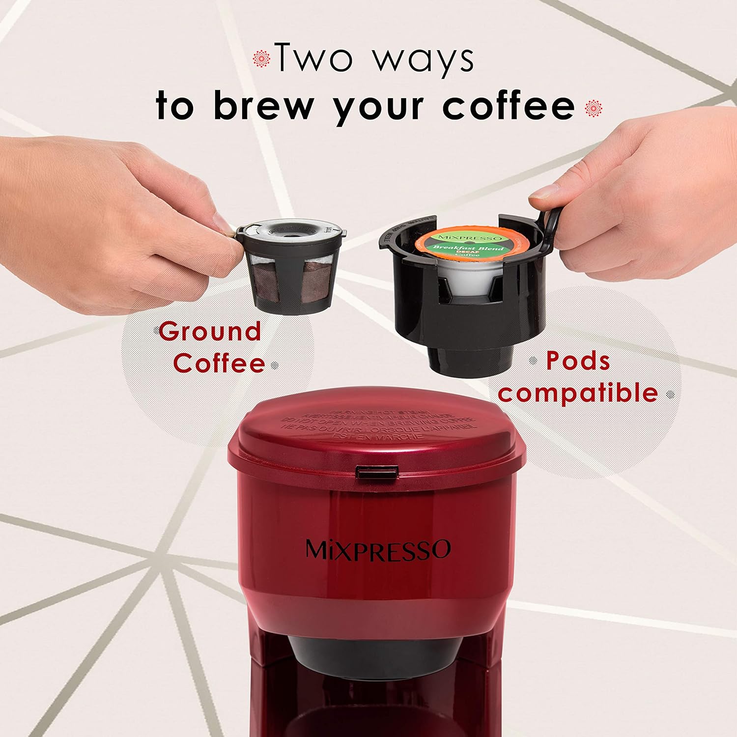 Mixpresso 2 in 1 Coffee Brewer, Single Serve & Personal Coffee Maker, Compact Size Mini, Quick Brew Technology, 14oz Red