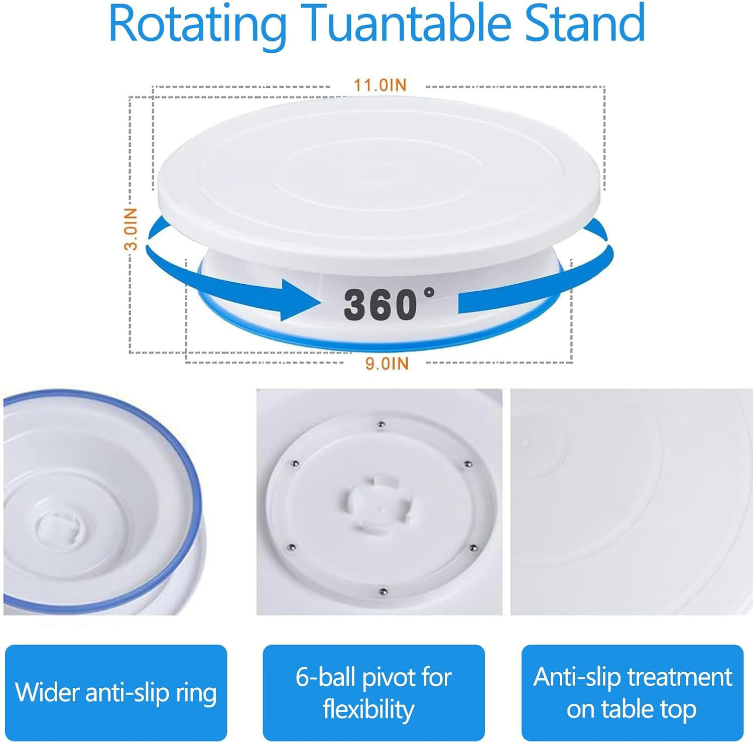 - [11" 360° Smooth Cake Decorating Turntable] - 11 inch smooth rotating cake turntable with a hidden ball bearing, it can 360º clockwise and counterclockwise rotation, and help you to achieve stunningly consistent patterns and gorgeous designs. Includes a non-slip blue silicone ring on a base - helps the turntable to stand securely during the cake decorating process, prevent sliding on the table. Ideal for beginners as well as for professionals.