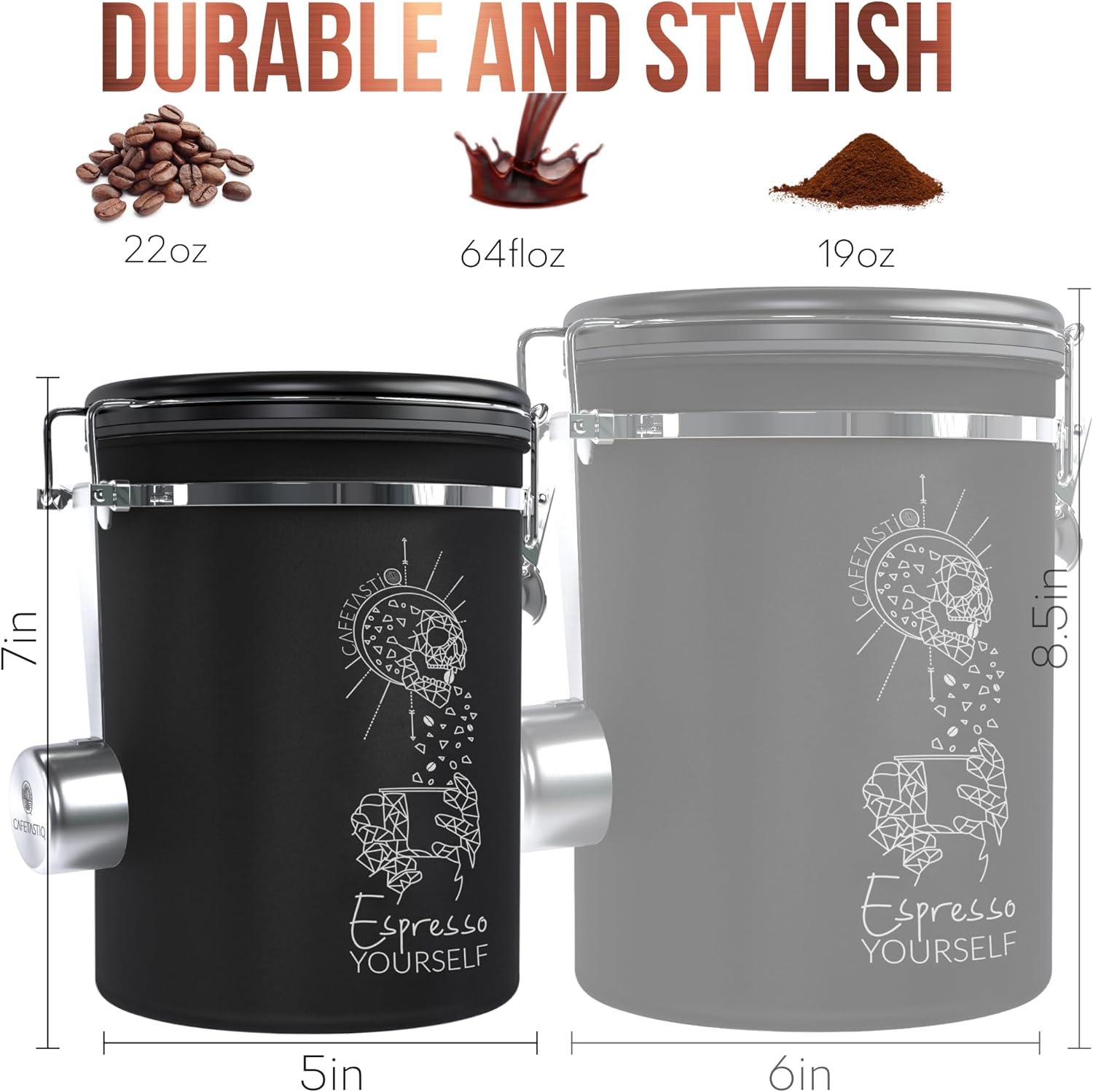 Coffee Canister – Airtight Stainless Steel Storage Container with Date Tracker & Scoop, Sealed Jar for Grounds, Beans, Tea, Flour, Cereal, and Sugar (Black Esspresso, 22OZ)