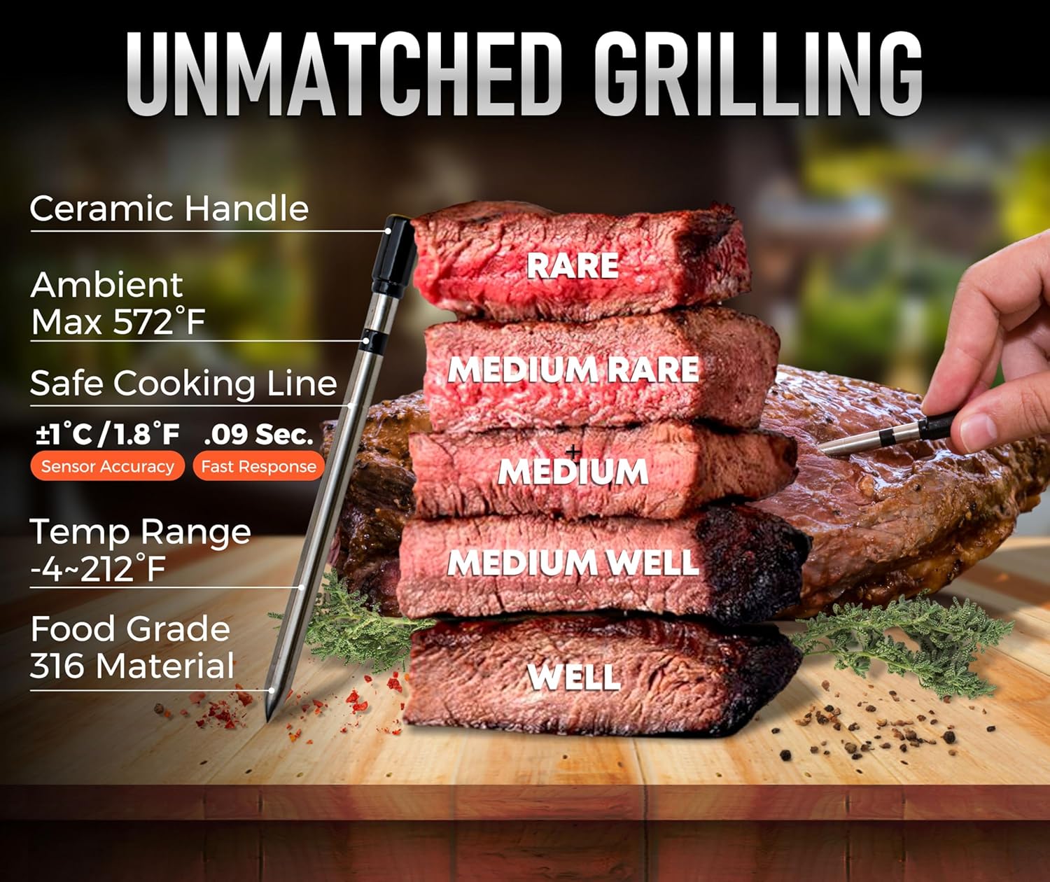 - For Any Type of Meat - From steaks to fish and ribs, our meat thermometer for grilling adapts to any method, making it a must-have grill meat thermometer for grillers and chefs alike.