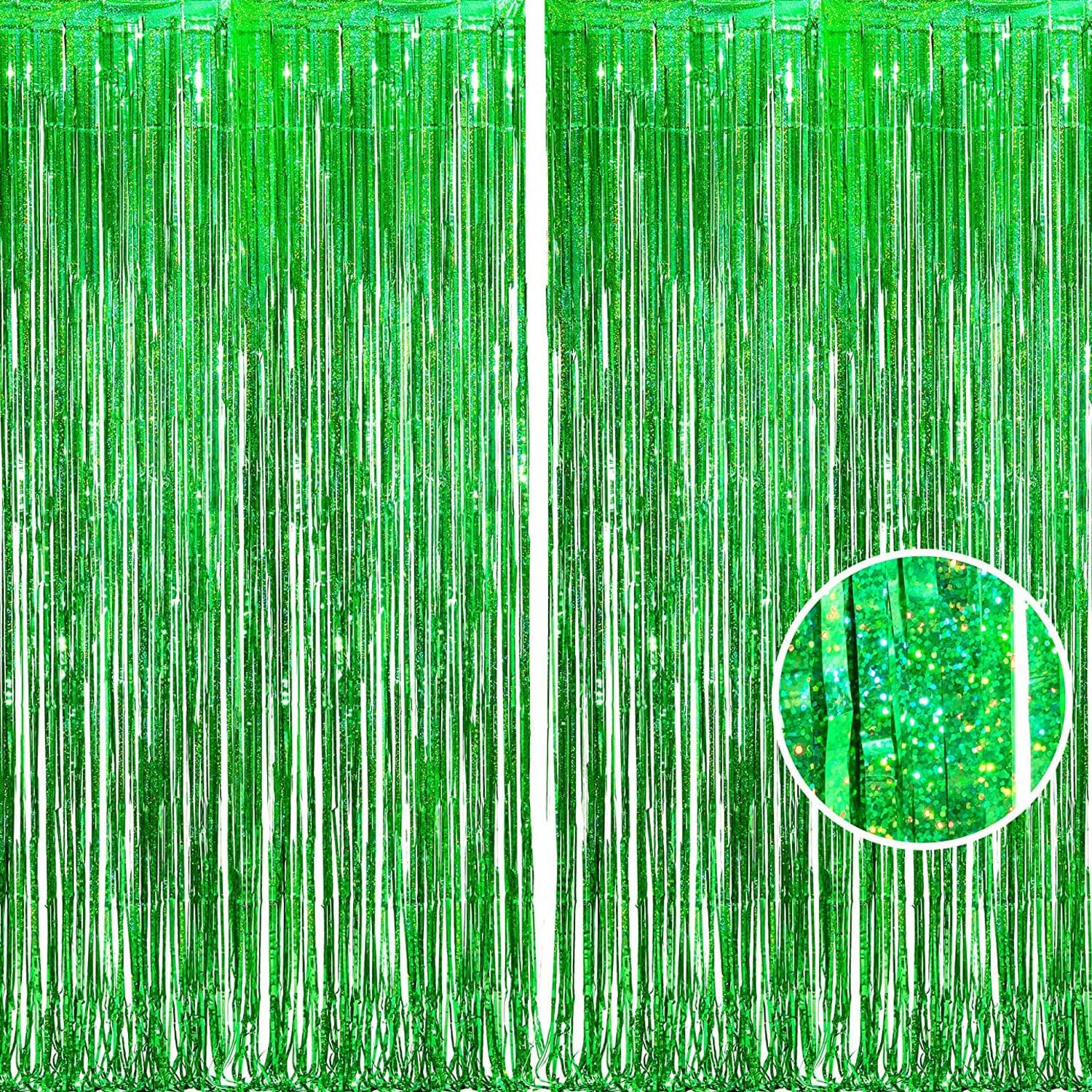 BRAVESHINE Green Metallic Tinsel Foil Fringe Curtains - 2 Pack 3.2 x 8.2 ft Metallic Photo Backdrop for Graduates-Theme/St Patricks Day/Hawaiian/Luau/Dinosaur/Jungle-Theme/Christmas Party Decorations
